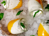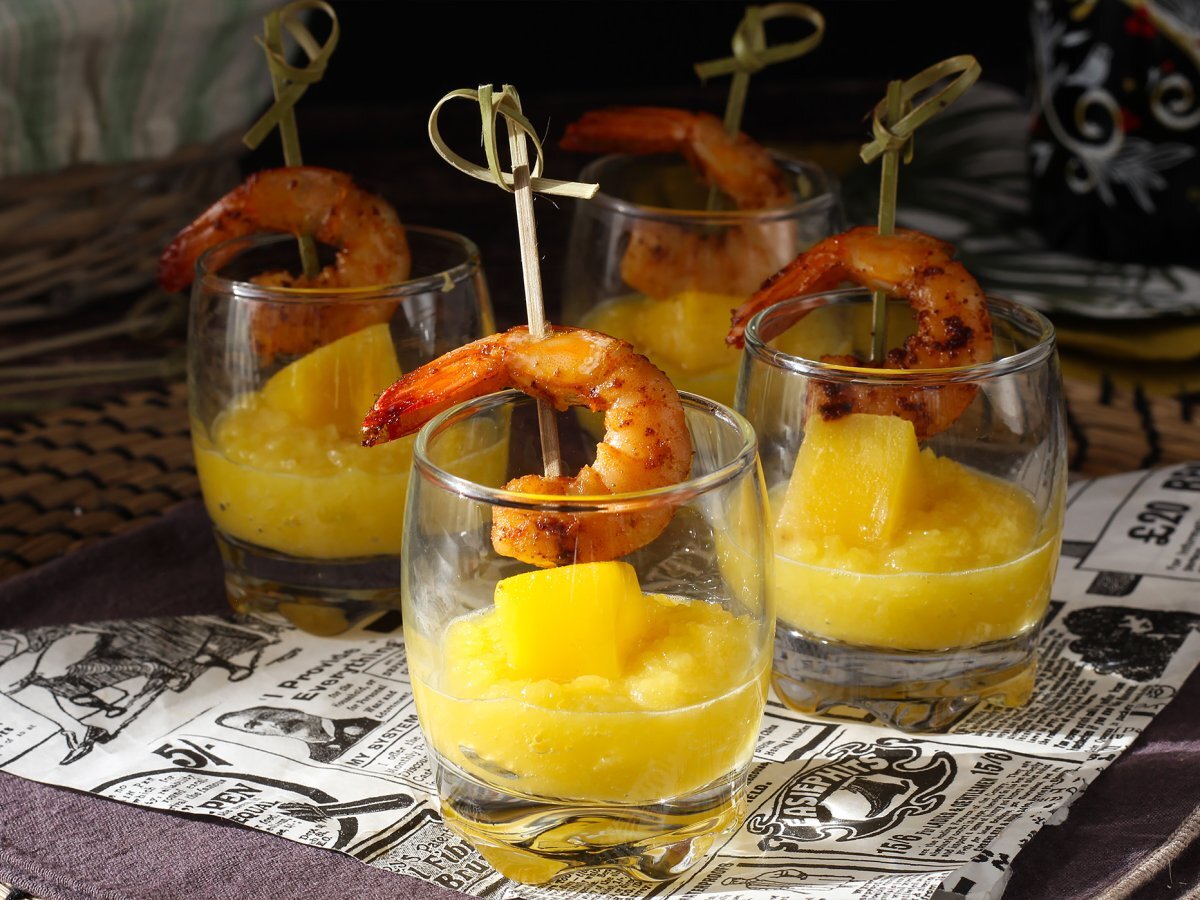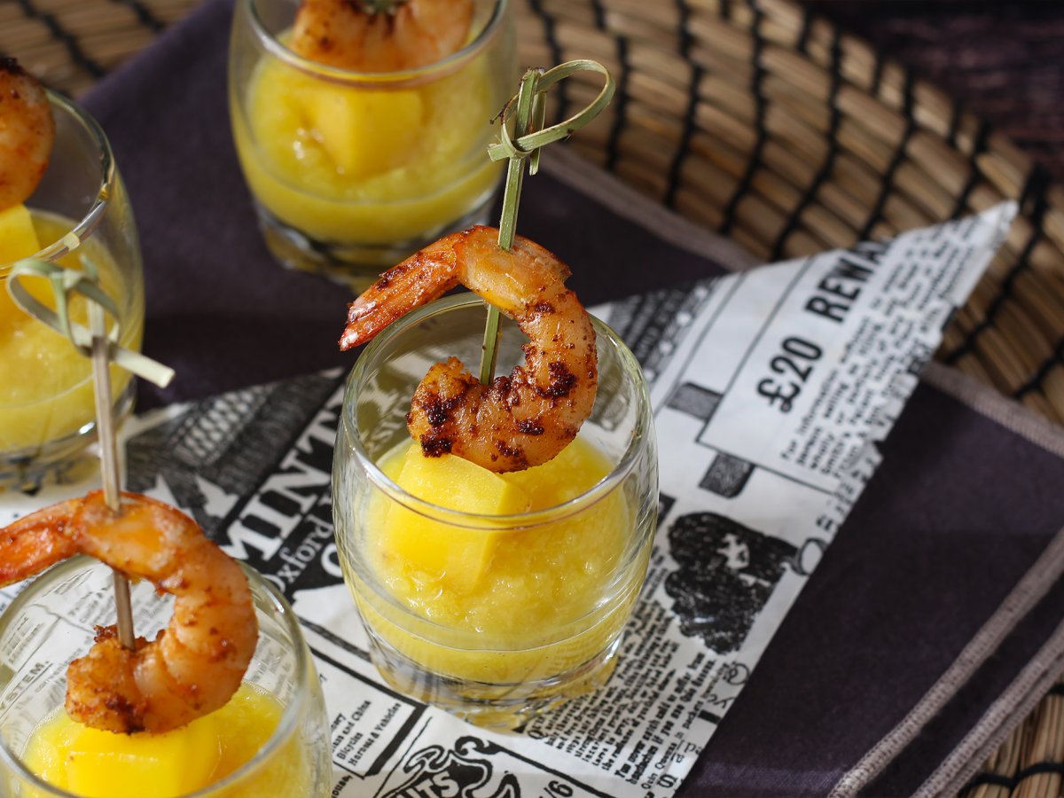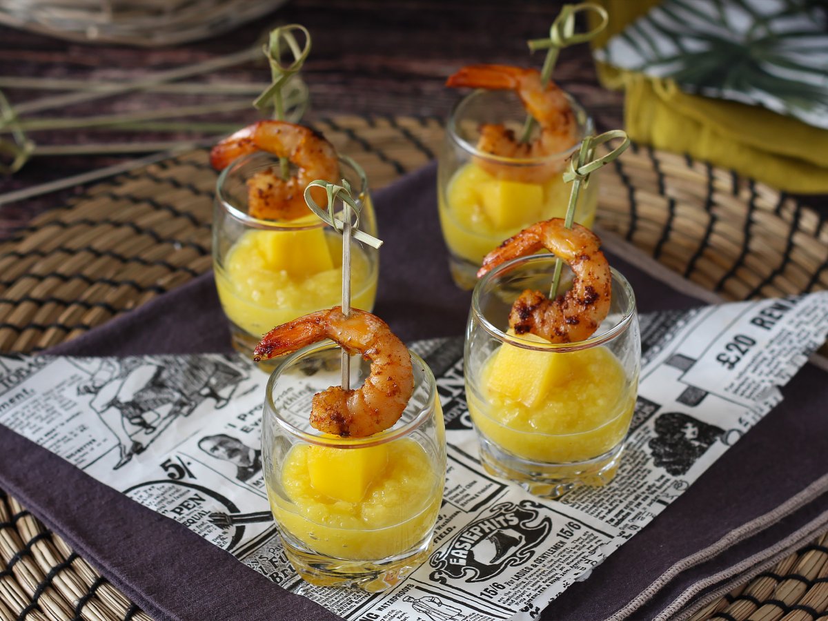 Vasitos salados de brocheta de gambas y mango