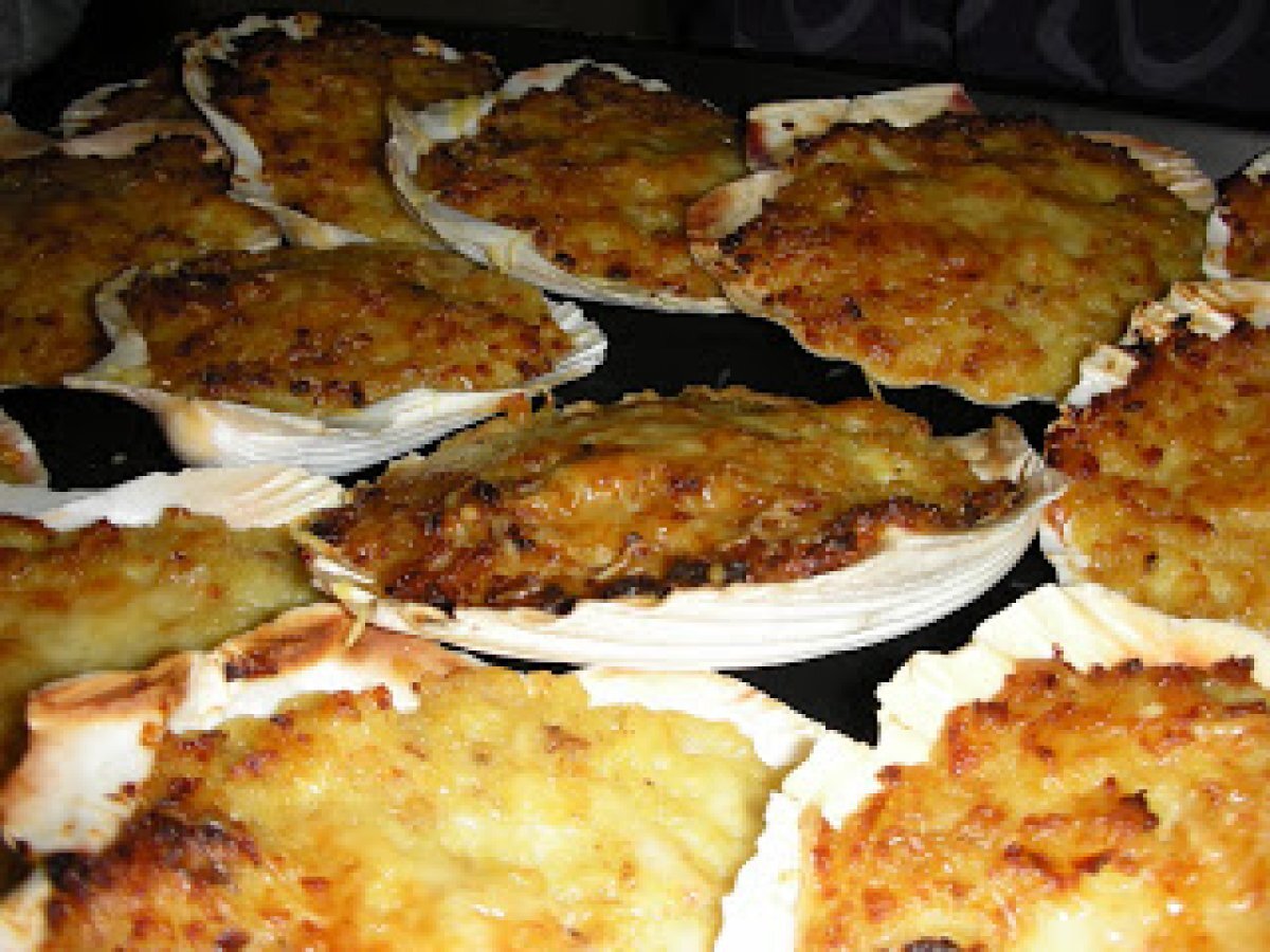 Vieiras gratinadas rellenas de merluza y gambas AperitivoFácil30 min389 Kcal Enviar esta receta a un amigo Imprimir esta página Preguntar al autor Publicar la foto de esta receta Ingredientes 4 1 kilo de merluza congelada sin piel ni espinas 500 g de gambas peladas congeladas 1 cebolla Leche Harina Sal Aceite Costo estimado: 22.2Euros€ (5.55€/porción)