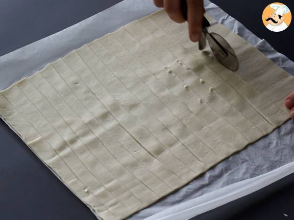 Cortar la masa de hojaldre en tiras de 1 centímetro de grosor. A nosotros nos han salido 16 tiras.