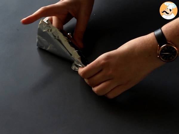 Cortar unos cuadrados de papel de aluminio y plegarlos en 4. A continaución vamos a darle forma de cono (tal y como se muestra en el vídeo).