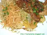 Ingredientes: 4 jamoncitos de pollo. 2 patatas medianas 1 cebolleta 1 cucharada de mostaza de Dijon a la Antigua 1/2 vaso de agua de vino blanco 30 g de fideos...