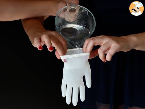 Verter agua dentro del guante de látex. No lo rellenes del todo para hacer un nudo y cerrarlo. También puedes utilizar una pinza o una goma.