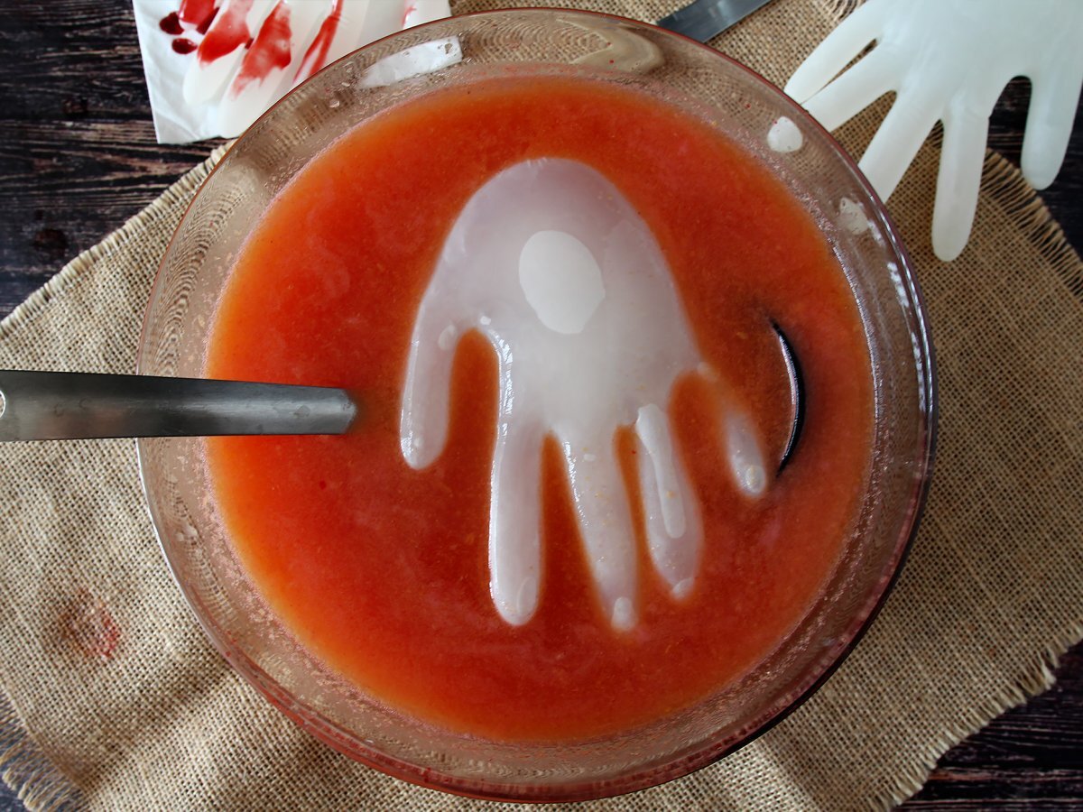 Aquí hemos hecho un cubito de hielo con forma de mano pero existen otras fórmulas para decorar esta bebida. Puedes hacer unos escalofriantes ojos introduciendo un arándano dentro de un lichi o decorar con gominolas con formas de gusano, de dentadura de drácula o usar sirope de fresa para decorar los bordes del vaso. Consejo: Procura que todos los elementos decorativos de tu cocktail sean comestibles para evitar accidentes.