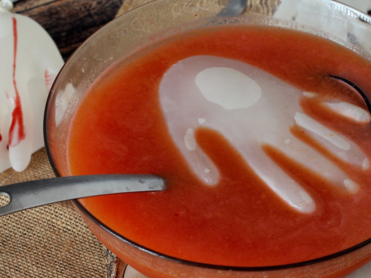 Esta es la prueba de que no se necesita mucho para hacer un original cóctel sangriento para Halloween... Decorarlo con una mano de hielo ¡Una idea sencillísima y que va a encantar a todos! Vamos a necesitar un guante de látex relleno de agua congelada, ¡y ya tenemos un cubito con forma de mano estupendo para colocarlo en nuestra bebida, enfriarla y darle un aspecto terrorífico. Muy sencillo, verdad? A continuación te dejamos el tutorial para que tú también puedas hacer este sabroso cocktail sangriento y decoralo con la mano de hielo. Por cierto, esta bebida la hemos hecho con alcohol pero puedes quitarle el vodka para hacerla apta para niños y organizar una fiesta de Halloween terroríficamente divertida ¡Está buenísimo igual! ;-)