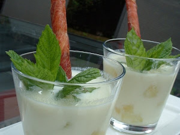Crema de melón y yoghurt con crujiente de jamón serrano AnteriorSiguiente BebidaFácil1 h 10 m Enviar esta receta a un amigo Imprimir esta página Preguntar al autor Publicar la foto de esta receta Una nueva receta para preparar. Ingredientes 2 1 melón piel de sapo 250 g de yoghurt griego o turco hierbabuena 150 g de jamón serrano o mejor ibérico sal, pimienta grissini