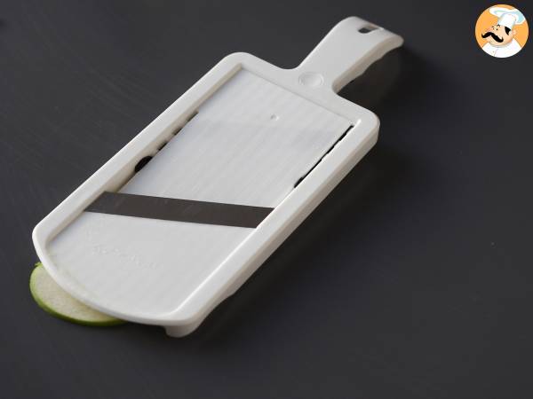 Cortar una manzana en rodajas finas con una mandolina o un cuchillo.