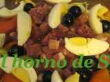 Ingredientes: 1 bolsa de lechuga gourmet 1 pimiento verde de los gordos jamón serrano en tacos 1 tomate 1 huevo por persona 12 olivas negras 2 cucharadas de...