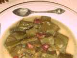 Ingredientes: 1 kg de cardo 25 almendras peladas y tostadas 2 ajos 1 vaso de leche 1 cucharada de maicena 1 vaso de agua 150 g de taquitos de jamón serrano