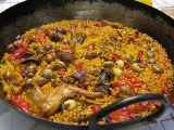 Ingredientes: 1 conejo 400 g de caracoles 400 g de arroz 1 dl de caldo de carne 2 tomates 200 g de almendras 200 g de pan frito 1 pimiento verde y rojo 4 ajos...