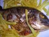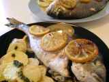 Ingredientes: Para 2 personas 2 doradas patatas 1/2 cebolla 1 diente de ajo sal aceite 1 hoja de laurel pimienta negra 1 limón 75 ml. de caldo de pescado 1 buen...