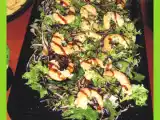 Ensalada de fideos de arroz, langostinos, aguacate, huevo y cilantro