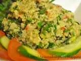 Ingredientes: Para la base de quinoa: 150 g de quinoa 300 ml de agua Para la ensalada: 2 tomates ½ cebolla 1 puñado de hojas de menta fresca 1 puñado de perejil...