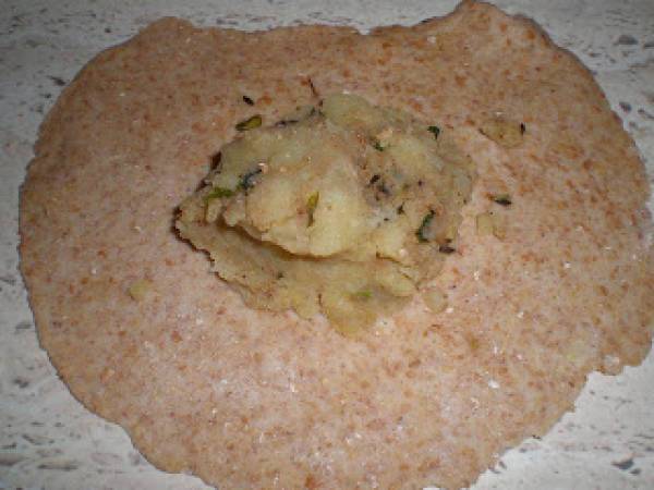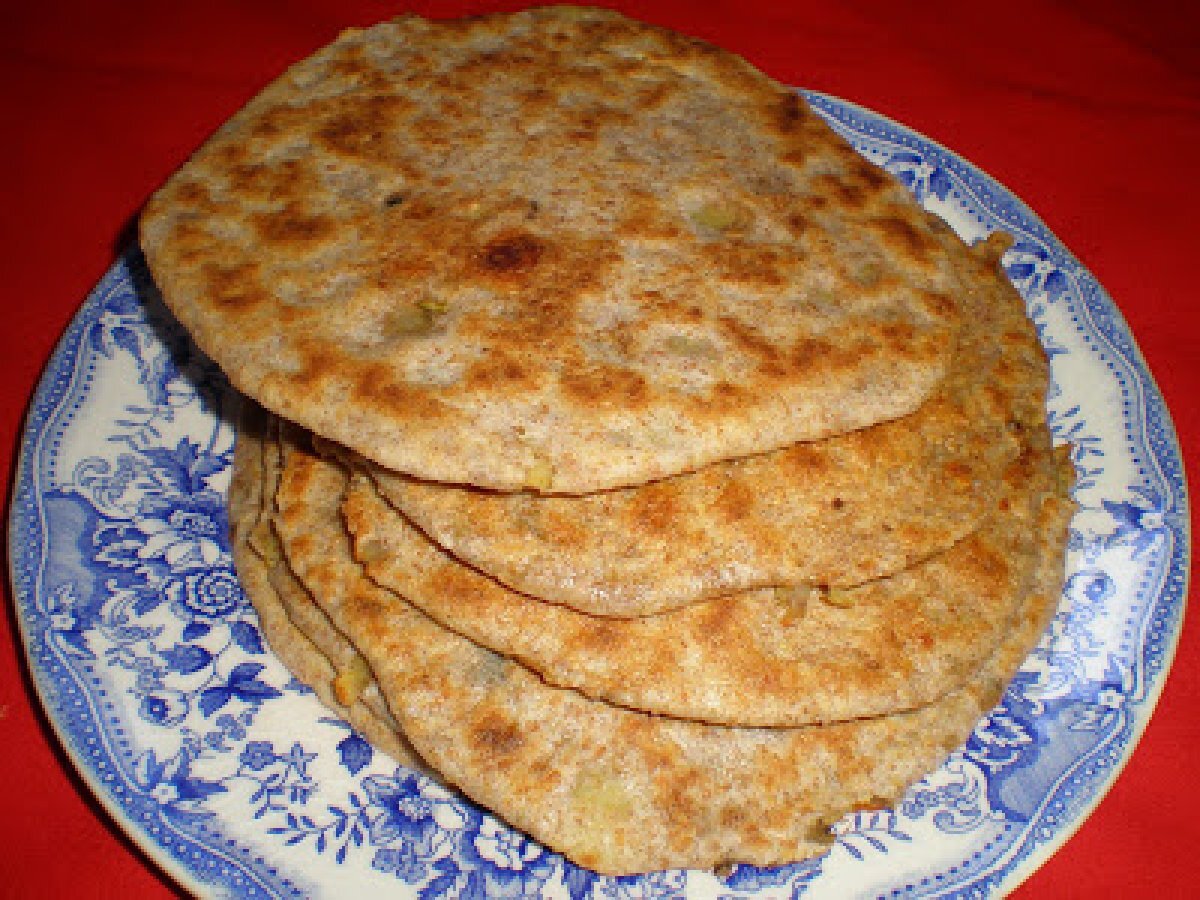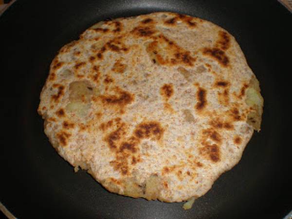 Este es un pan indio relleno de patata. "Aloo" significa patata. Una paratha se puede rellenar de lo que queráis. Lo tradicional es usar como grasa "ghee" que es mantequilla clarificada pero esta vez yo he preferido usar aceite de girasol. En la cocina india no se usa el aceite de oliva. Puede hacerse con harina común o integral, como en este caso he hecho yo.