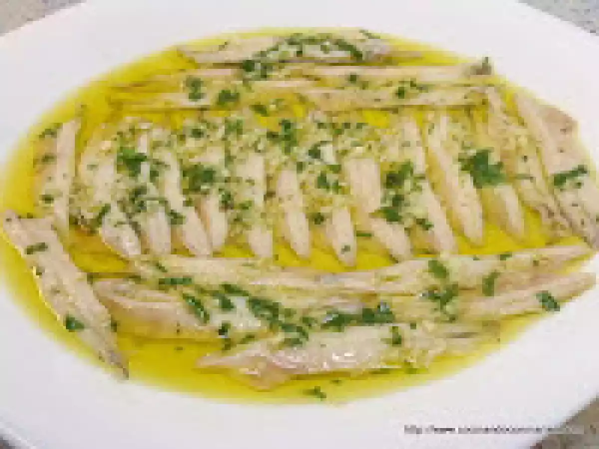Anchoas en vinagre / boquerones en vinagre EntranteMedio15 min513 Kcal Enviar esta receta a un amigo Imprimir esta página Preguntar al autor Publicar la foto de esta receta Ingredientes 4 1 kg de anchoas 1 Litro de vinagre de vino blanco 1 Limón Sal Aceite de Oliva Ajos Perejil Costo estimado: 22.79Euros€ (5.7€/porción)