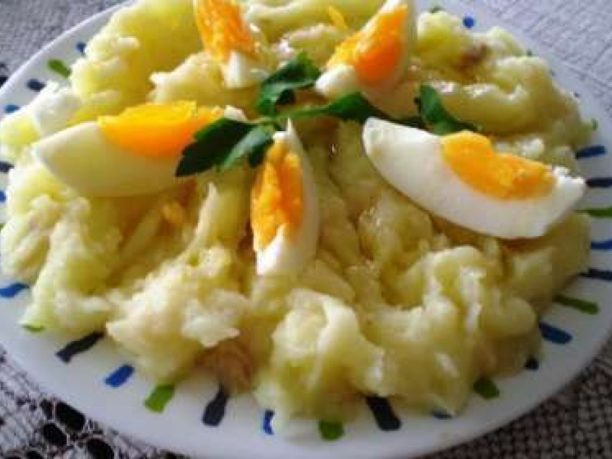- En este agua cocer las patatas cortadas a trozos. Cuando estén blandas sacarlas. En una fuente las vamos machacando con la ayuda de un tenedor y añadiendo un poco del agua de haberlas cocido. Debe quedar una consistencia jugosa, pero no líquida. Añadir el aceite.
