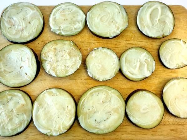 La berenjena es probablemente la verdura que más me gusta, y preparada de esta forma no tiene nada de grasa, solo la grasa que aporta la veganesa con la que se unta cada rodaja. Yo las acompaño con unas patatas gajo (fritas en la freidora de aire) y con una salsa kebab o barbacoa.