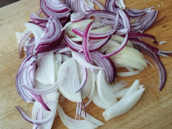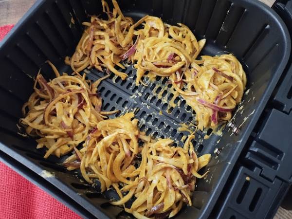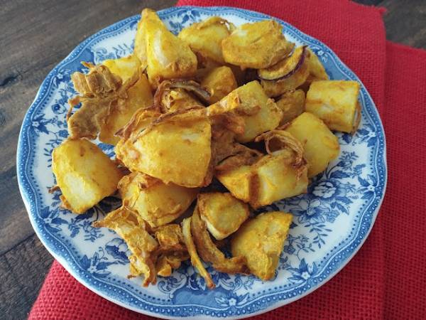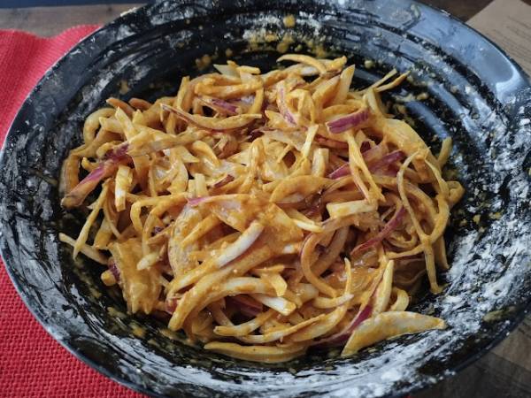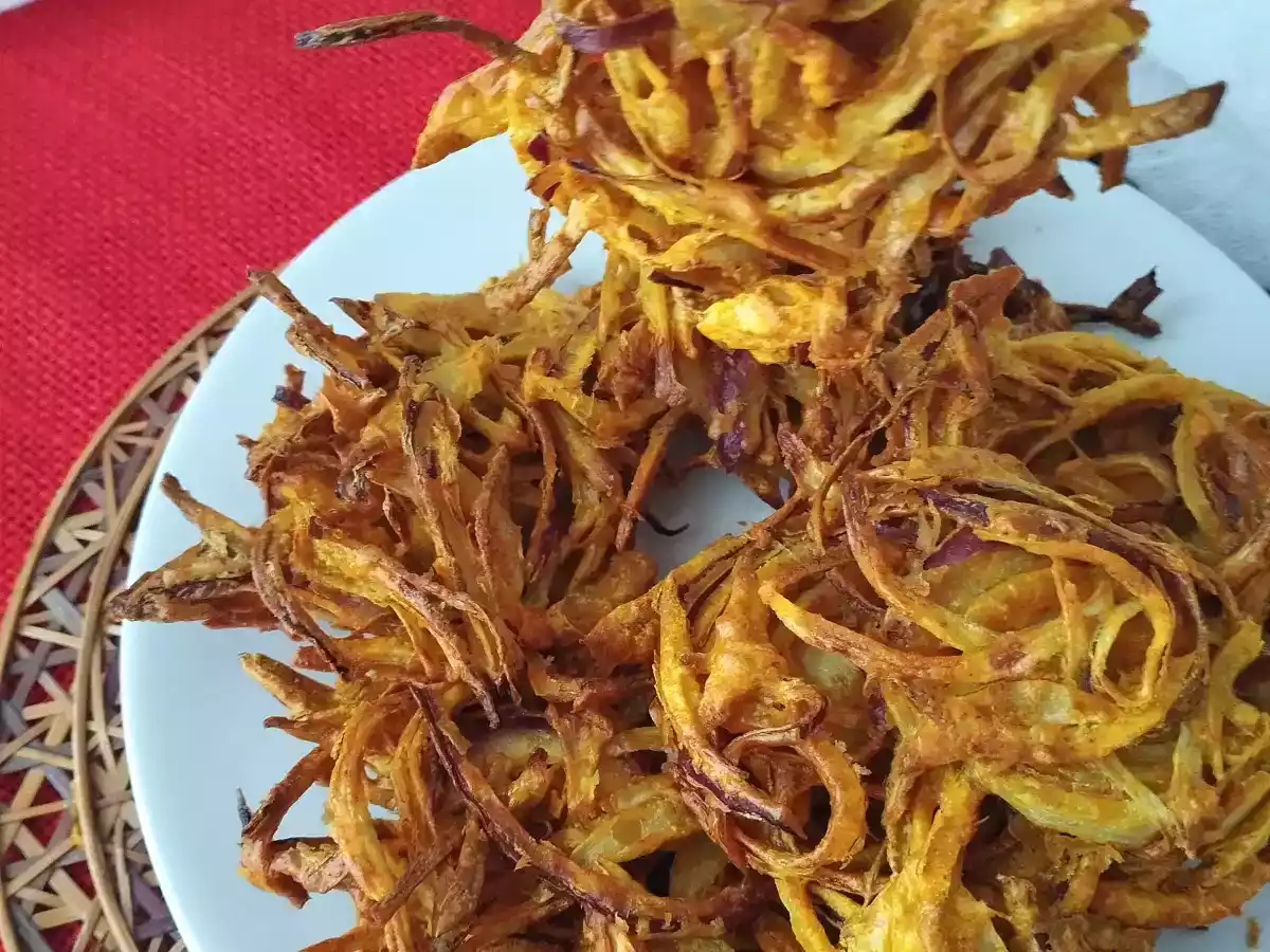 Bhaji es el término más conocido en Occidente para lo que en la India se conoce como pakora. Son todo tipo de verduras rebozadas en harina, por lo general de garbanzo, y fritas en bastante aceite. Podríamos decir que son una especie de buñuelos, con una textura crujiente gracias a la harina de garbanzo que no absorbe tanto aceite como la de trigo. También funciona bien con fécula de maíz que es lo que yo he hecho. Al no tener gluten los convierte en una alternativa ideal para quienes siguen dietas sin gluten. Una opción más saludable es cocinarlos en freidora de aire, lo que reduce la cantidad de aceite y, por lo tanto, las calorías, sin sacrificar el sabor ni la textura... bueno, un poquito si sacrifica, pero a mí me compensa. Los bhajis de cebollas son un entrante estupendo en los restaurantes indios y también son un clásico de la comida callejera. Se suelen servir con salsa tipo chutney o de yogur aunque yo no lo hice, se me olvidó. !Estoy tonta! Es una versión muy libre del bhaji porque originalmente no llevan huevo ni tantas especias. Si usas agua ve agregando hasta conseguir una pasta que cubra las cebollas, ni demasiado seca ni muy líquida. Pero a mi me ha gustado esta versión con huevo. En fin, es una versión del bhaji original y a mi me encanta.
