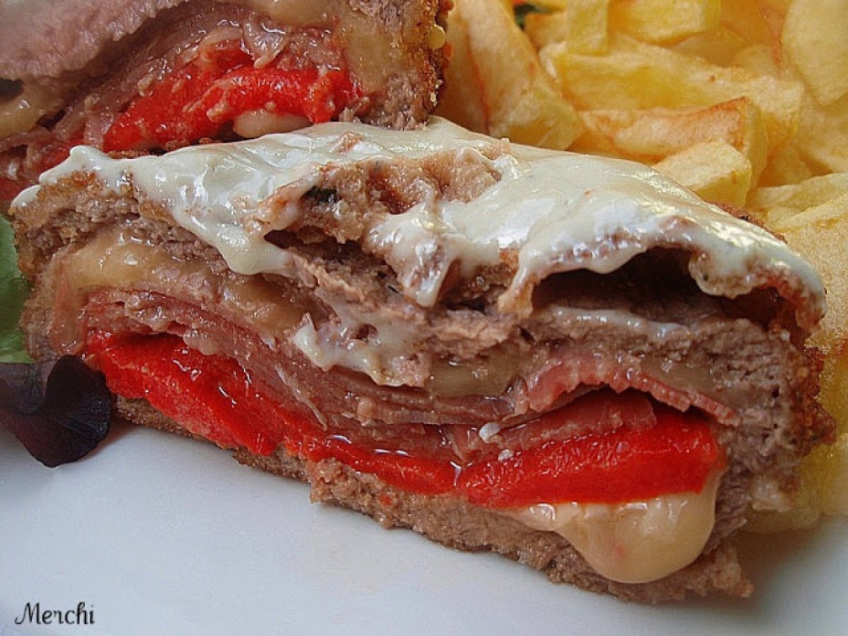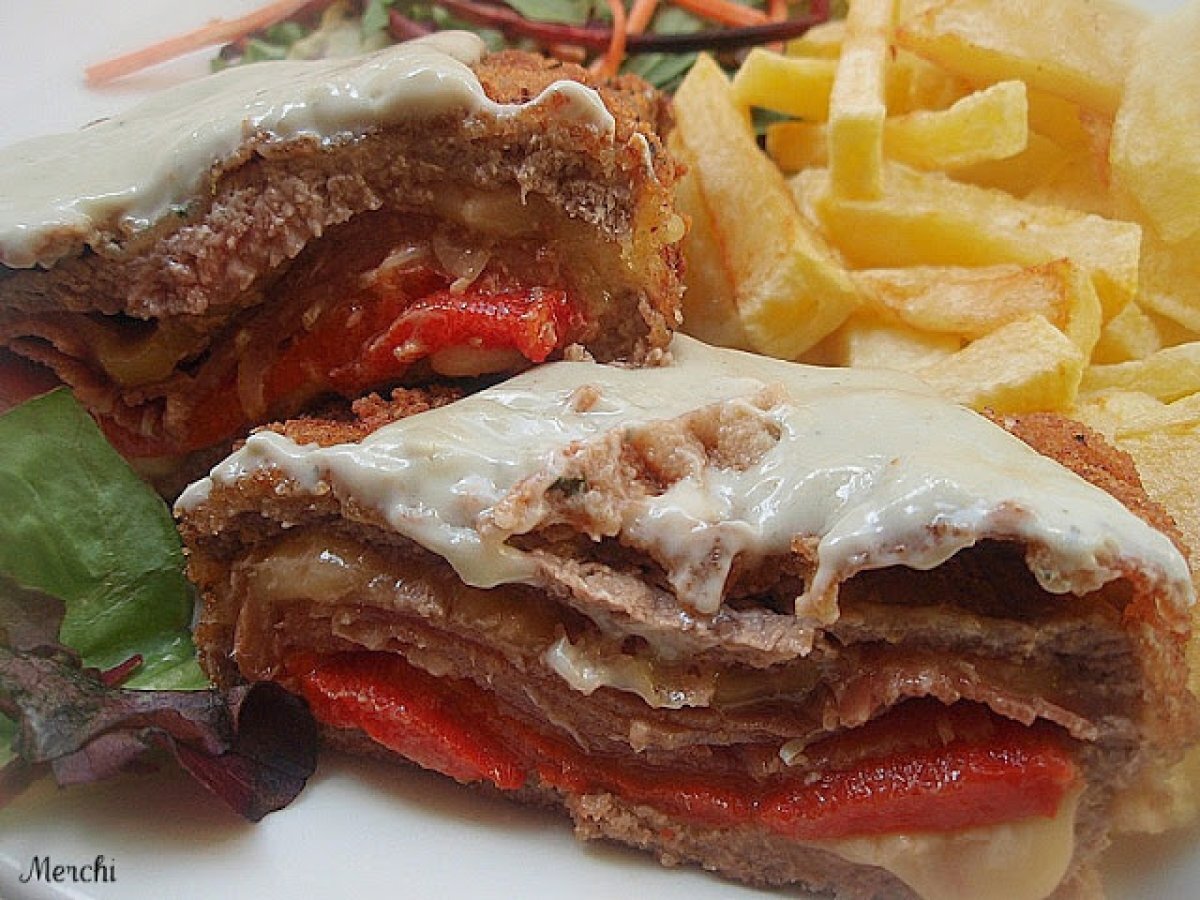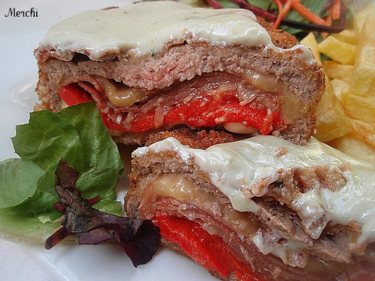 Cachopo de ternera al cabrales AnteriorSiguiente EntranteFácil50 min523 Kcal Enviar esta receta a un amigo Imprimir esta página Preguntar al autor Publicar la foto de esta receta Ingredientes 4 4 Filetes de ternera 4 lonchas de queso para sandwich 4 lonchas de jamón ibérico 1 pimiento rojo Pan rallado casero harina Pimienta. huevos Aceite Sal 250 ml de nata "La asturiana" 100 g de queso Cabrales Costo estimado: 12.4Euros€ (3.1€/porción)