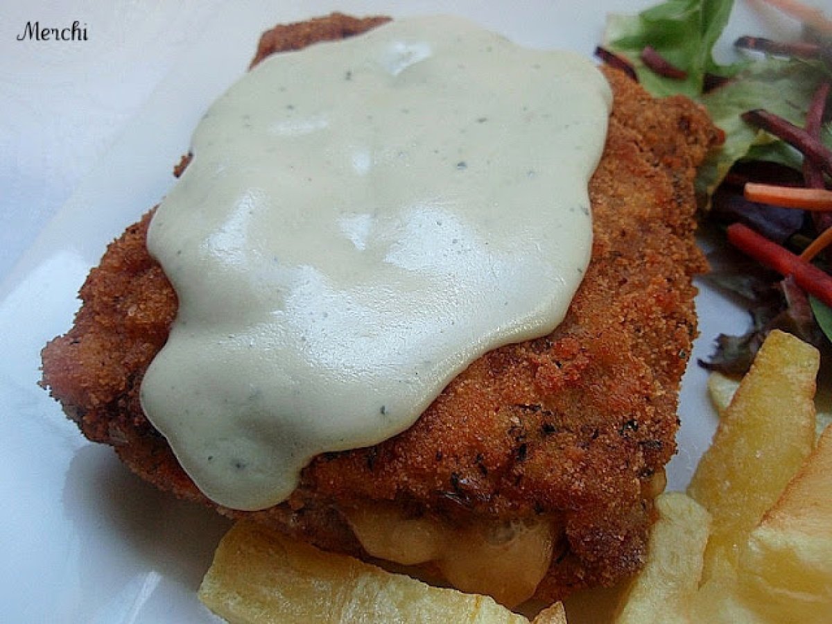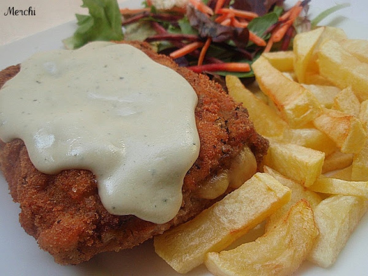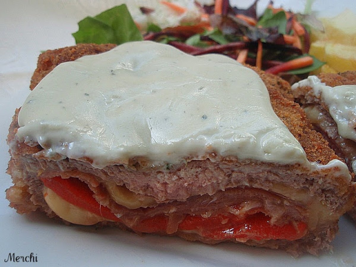 Cachopo de ternera al cabrales AnteriorSiguiente EntranteFácil50 min523 Kcal Enviar esta receta a un amigo Imprimir esta página Preguntar al autor Publicar la foto de esta receta Ingredientes 4 4 Filetes de ternera 4 lonchas de queso para sandwich 4 lonchas de jamón ibérico 1 pimiento rojo Pan rallado casero harina Pimienta. huevos Aceite Sal 250 ml de nata "La asturiana" 100 g de queso Cabrales Costo estimado: 12.4Euros€ (3.1€/porción)