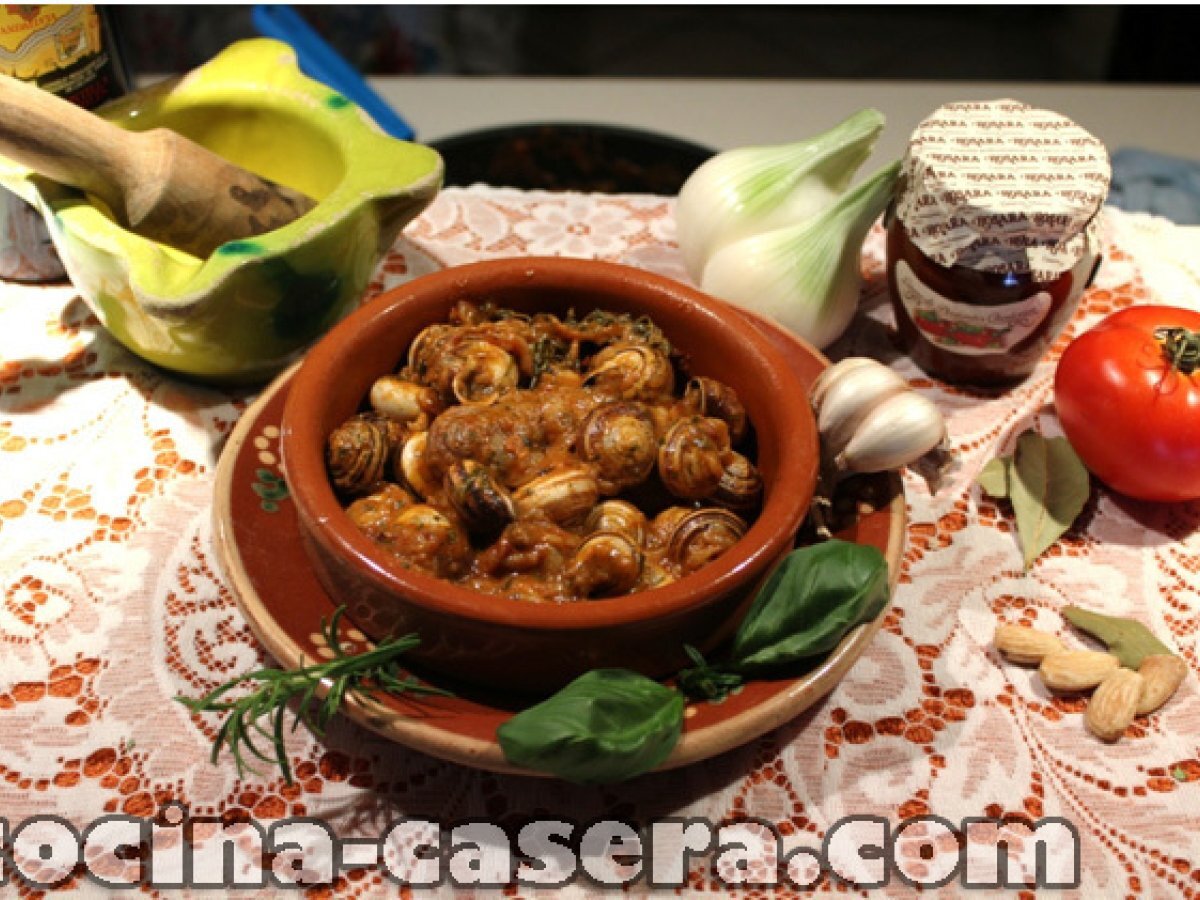Caracoles en salsa EntranteFácil1 hora Enviar esta receta a un amigo Imprimir esta página Preguntar al autor Publicar la foto de esta receta Ingredientes 3 1 bolsa de caracoles de 350 gr (congelados ya limpios) 3 dientes de ajo 1 cucharada de pimiento choricero (o la carne de dos pimientos puestos a remojo) 2 rebanadas de pan frito 1 tomate Tomillo y romero 1 cayena 1 hoja de laurel 2 cucharadas de almendras crudas 1/2 vaso de vino de jerez 1/2 vaso de agua con pastilla de avecrem o caldo de pollo. Opcional: Un poco de jamón o panceta picada