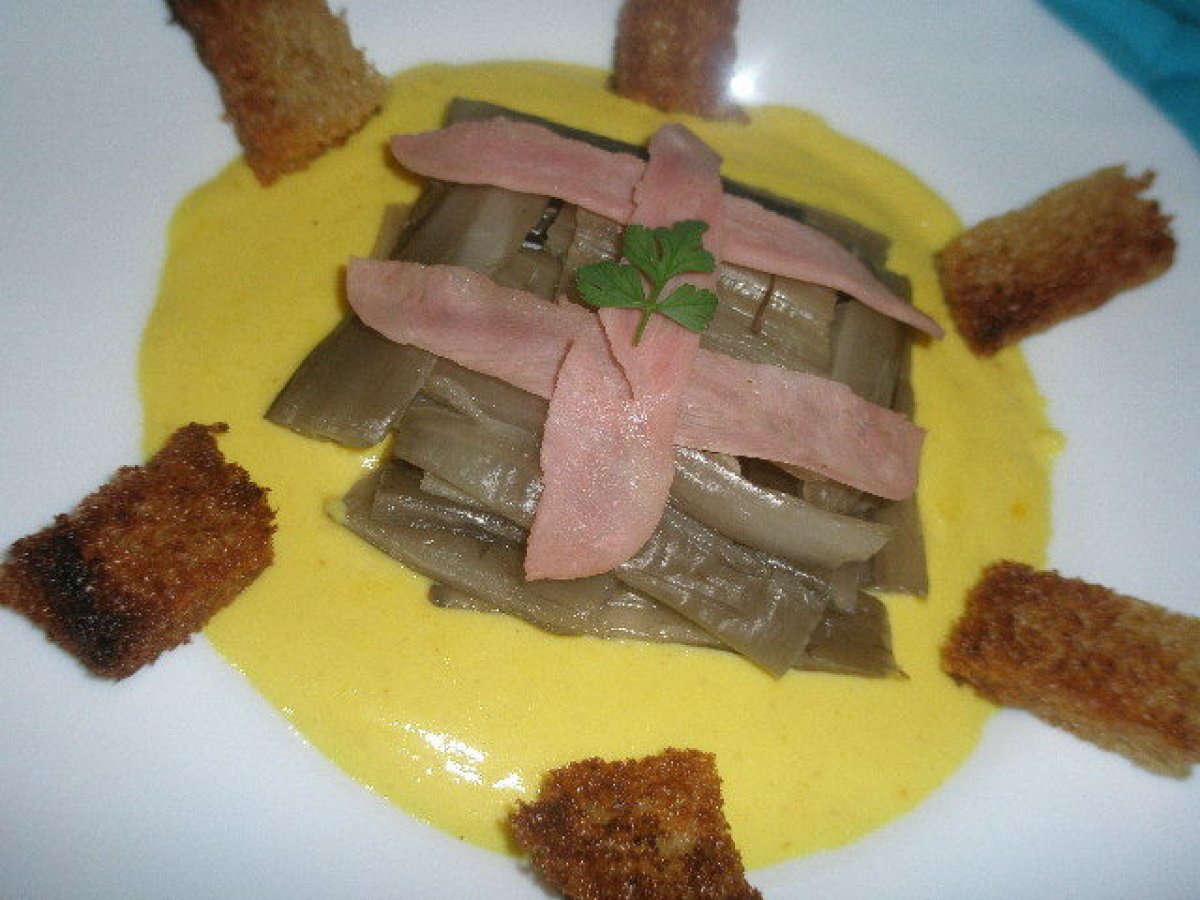 Pon en el plato la salsa y encima los cardos, jamón york y pan