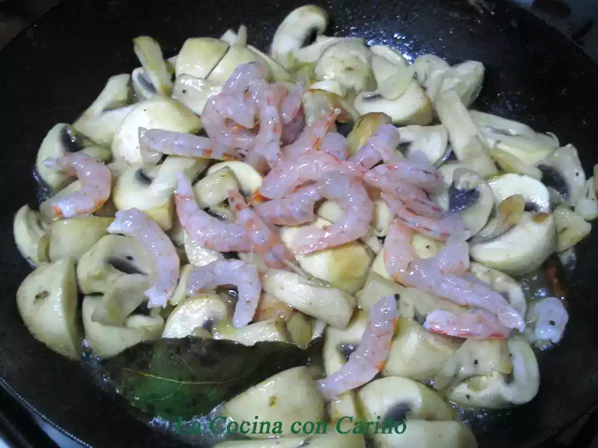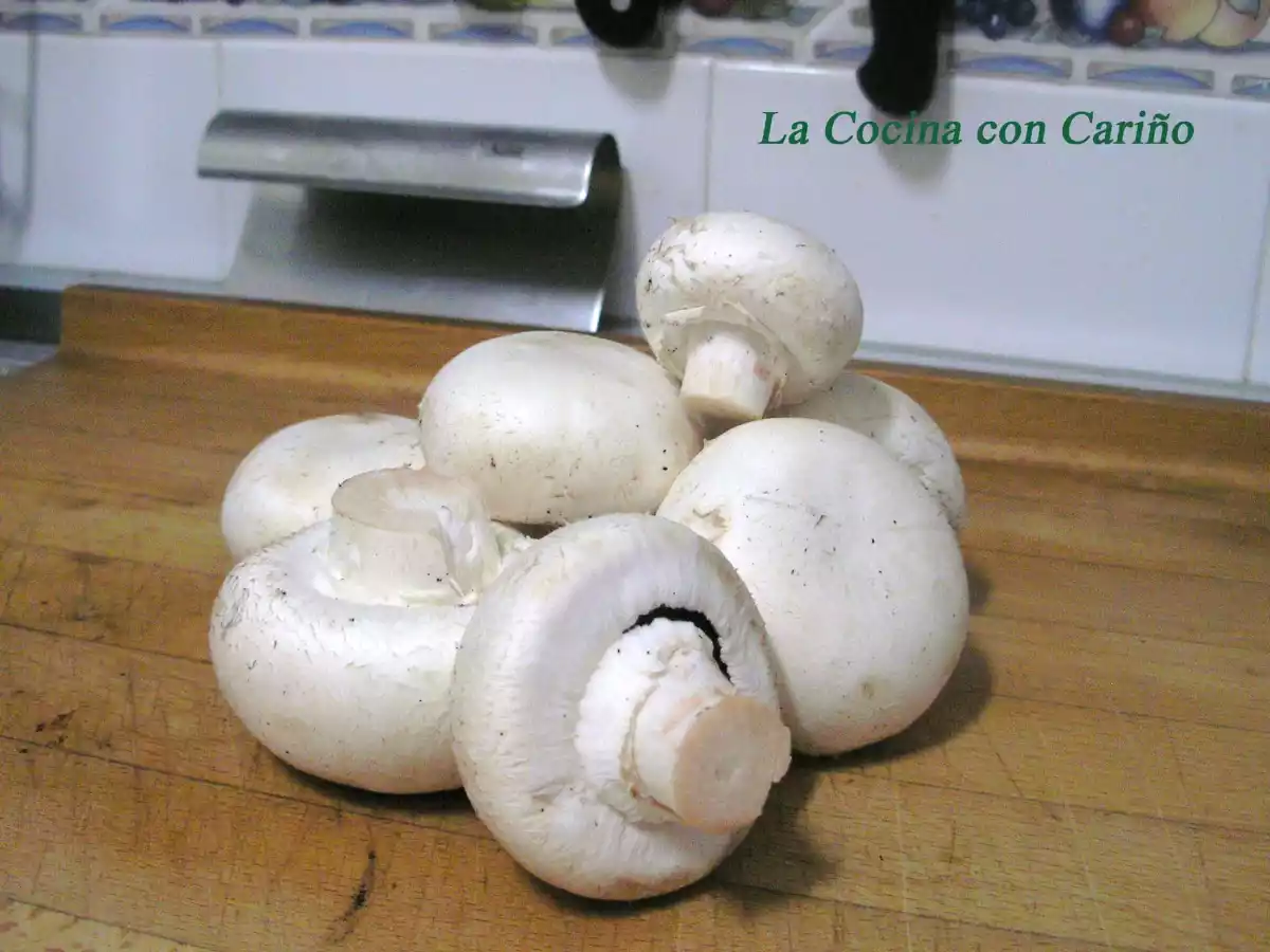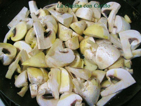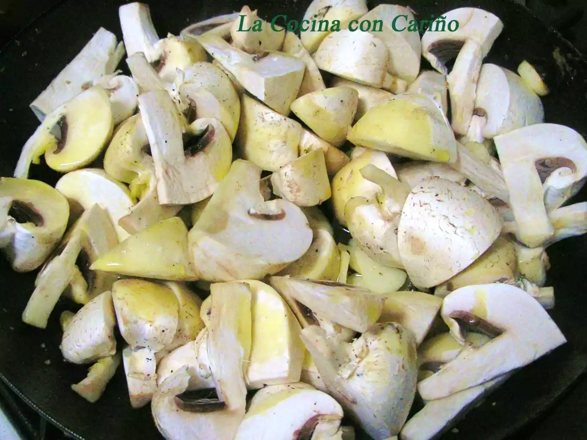 No deja de ser un simple salteado, pero el tema champiñón, es algo que llevo clavado muy dentro, porque la gente, bares, restaurantes, etc., tienden a hacerlos finitos, muy laminados y pierden esa deliciosa textura crujiente que tienen y gran parte del sabor, ya que pasa a la salsa y no queda en el hongo, por lo que te hinchas a mojar pan, pero el champiñón, ná de ná.
