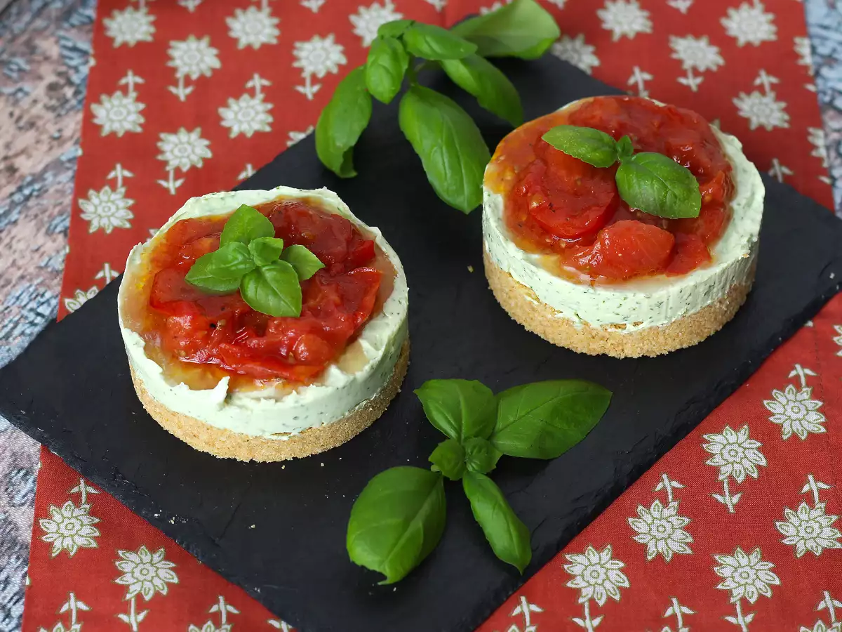 Cheesecake salado de queso crema, albahaca y tomates cherry