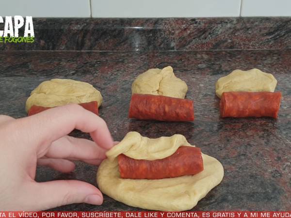Ahora cogemos uno de los trozos y con los dedos los vamos aplanando, le colocamos un trozo de chorizo o también podéis utilizar chistorra y procedemos a envolver el chorizo con la masa, sellamos bien el choripán y lo dejamos en una bandeja de horno.