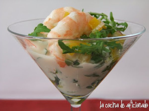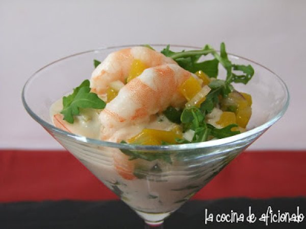 Cóctel de langostino y mango AnteriorSiguiente EntranteFácil1 hora263 Kcal Enviar esta receta a un amigo Imprimir esta página Preguntar al autor Publicar la foto de esta receta Ingredientes 4 1 mango Cebolleta Pimiento verde Rúcula Langostinos 4 cucharadas sopera de mayonesa 4 cucharaditas de zumo de naranja 2 cucharada de brandy 2 cucharadita de ketchup Costo estimado: 7.54Euros€ (1.89€/porción)