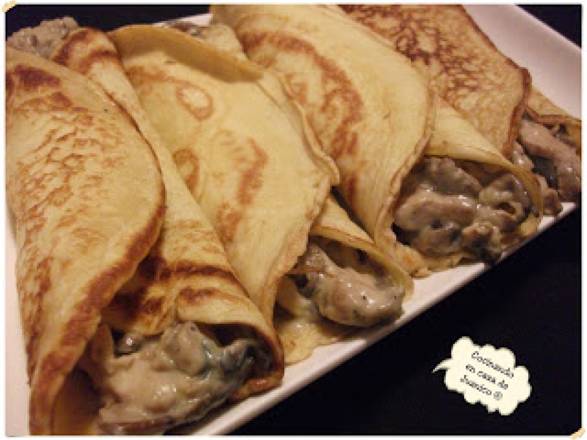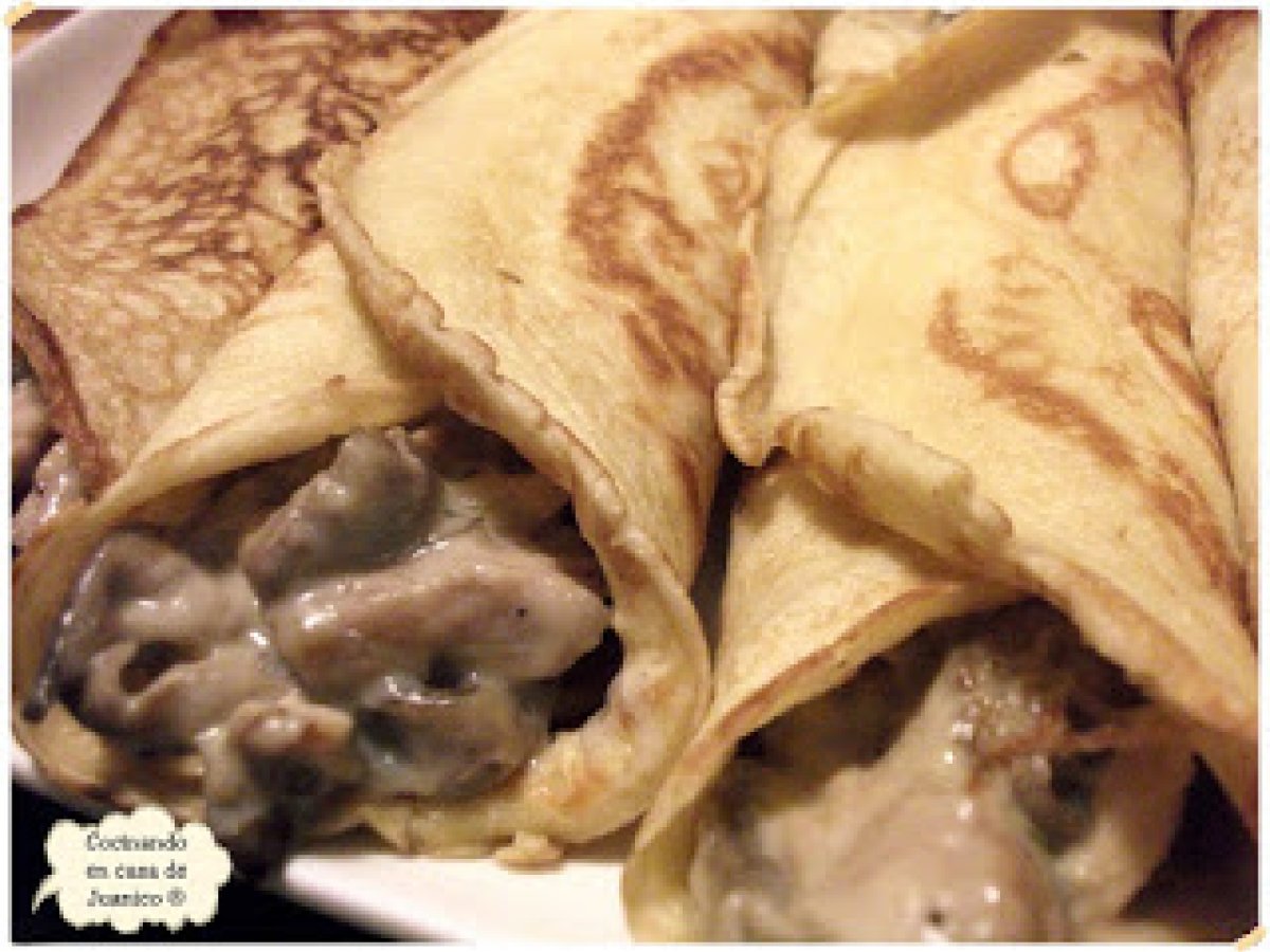 Unos deliciosos crepes rellenos con un salteado de cerdo, setas y cebolleta muy faciles de hacer y muy ricos.
