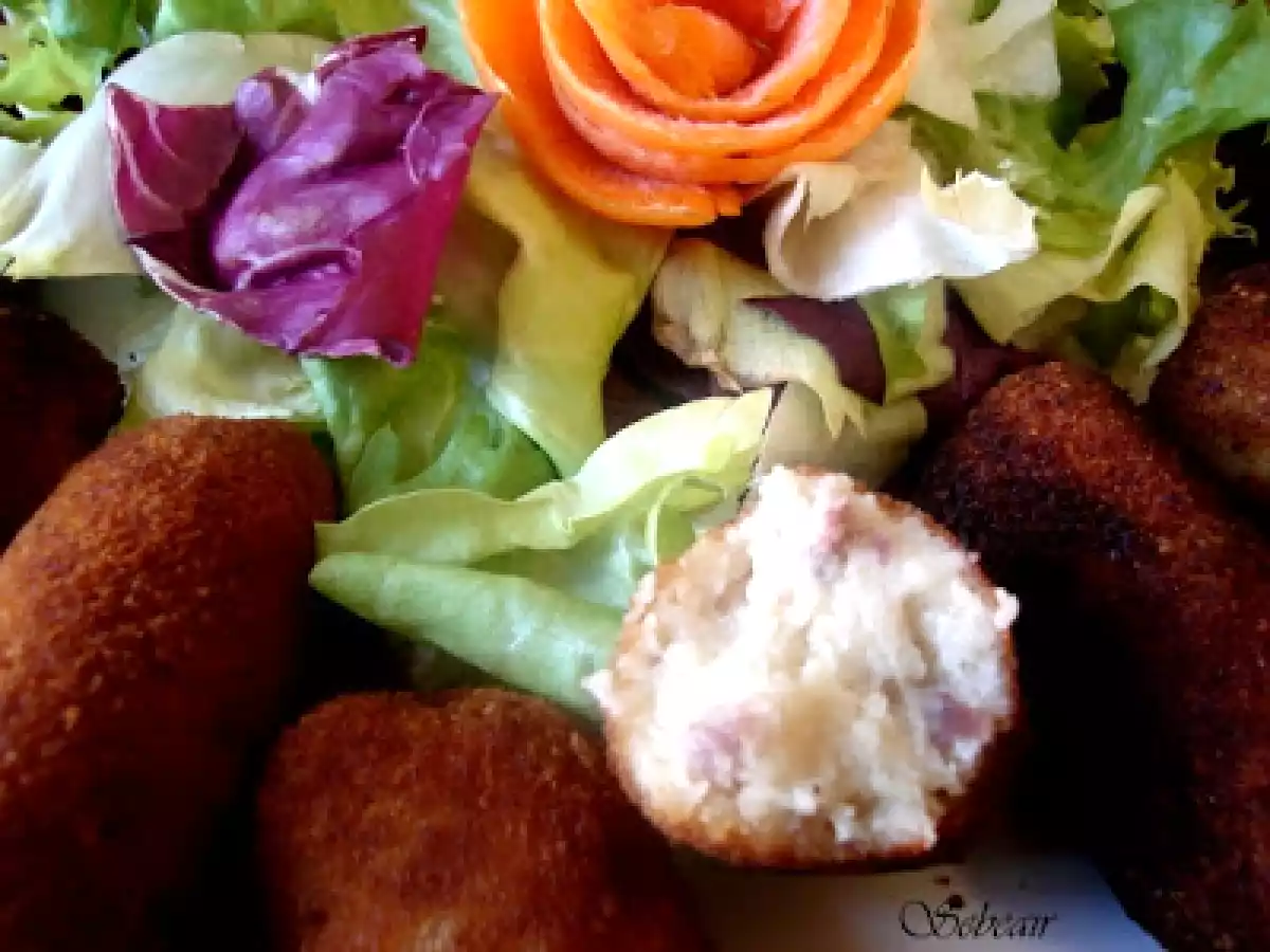 Croquetas de pollo e hilos de jamon serrano espuña (thermomix) AnteriorSiguiente EntranteFácil35 min440 Kcal Enviar esta receta a un amigo Imprimir esta página Preguntar al autor Publicar la foto de esta receta Ingredientes 4 800 g de leche entera a temperatura ambiente 50 g de aceite de oliva 180 g de harina pastilla de caldo de carne o de pollo 1 pechuga de pollo cocido en trozos 2 envases de hilos de jamón serrano Espuña (100 g) Media cebolla Nuez moscada al gusto Sal al gusto Costo estimado: 5.05Euros€ (1.26€/porción)