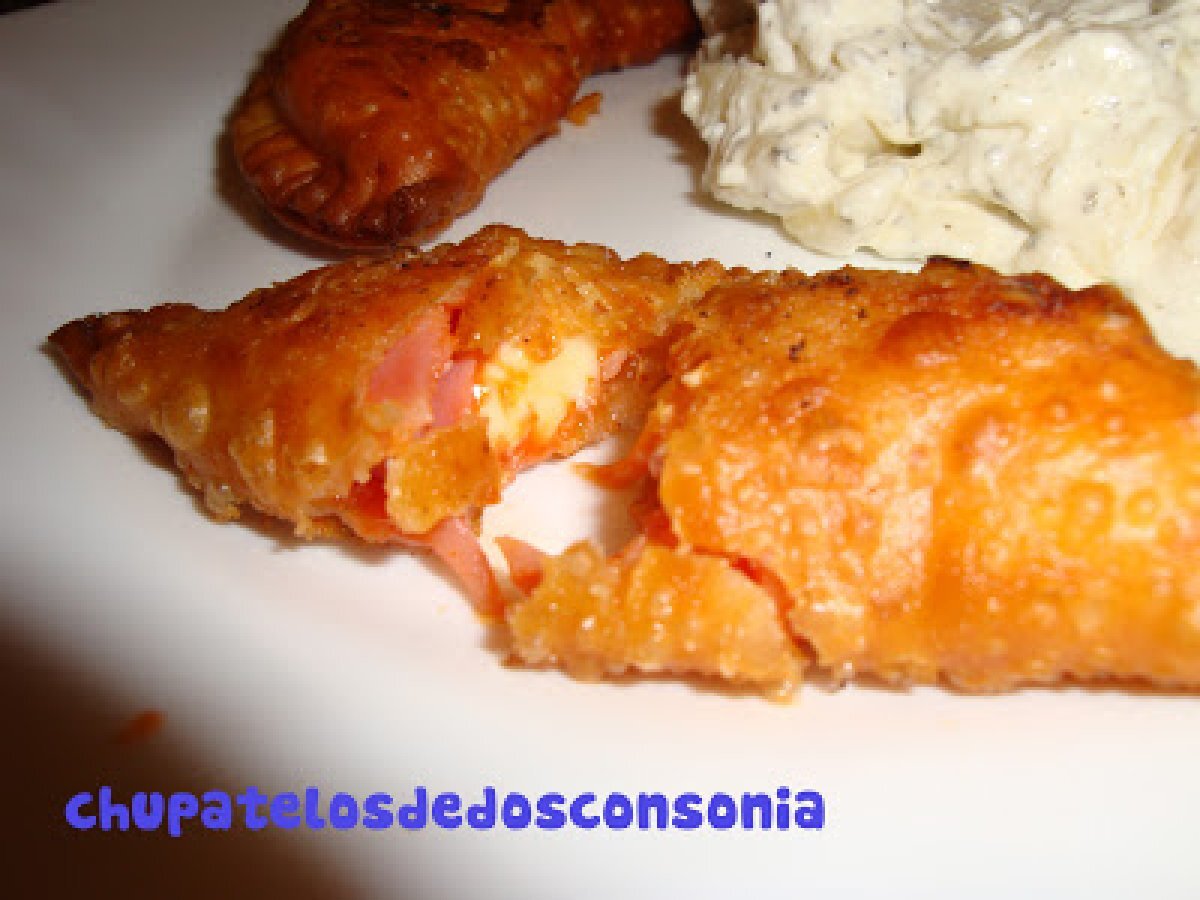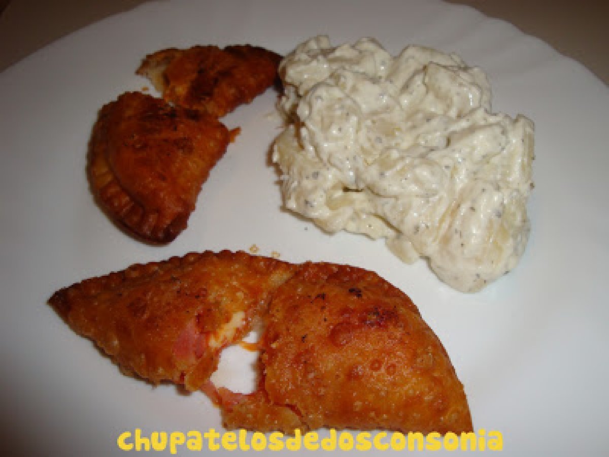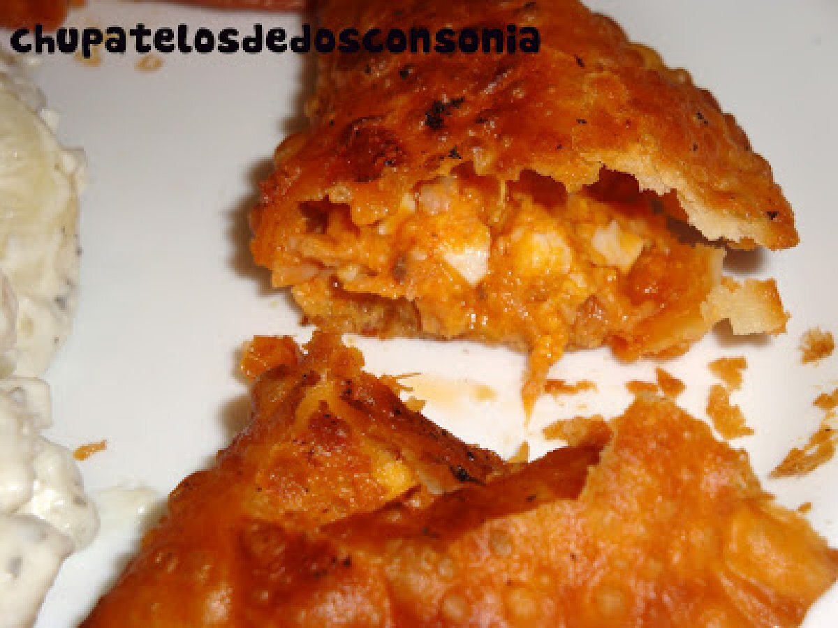 Empanadillas de atún y de jamón y queso AnteriorSiguiente EntranteFácil1 h 10 m Enviar esta receta a un amigo Imprimir esta página Preguntar al autor Publicar la foto de esta receta Ingredientes 3 Obleas de empanadillas Jamón york Queso en lonchas Tomate frito Orégano Atún claro Calvo en aceite vegetal Huevo cocido Tomate frito