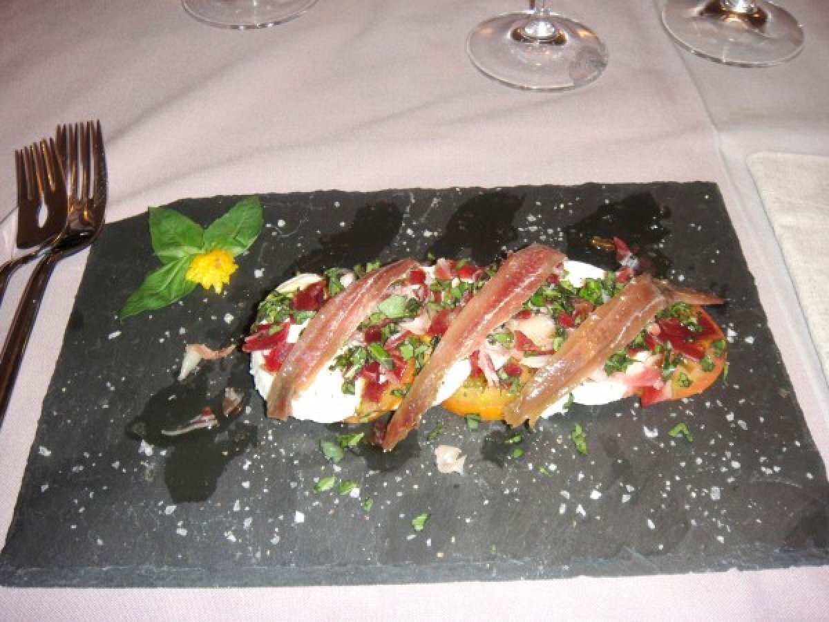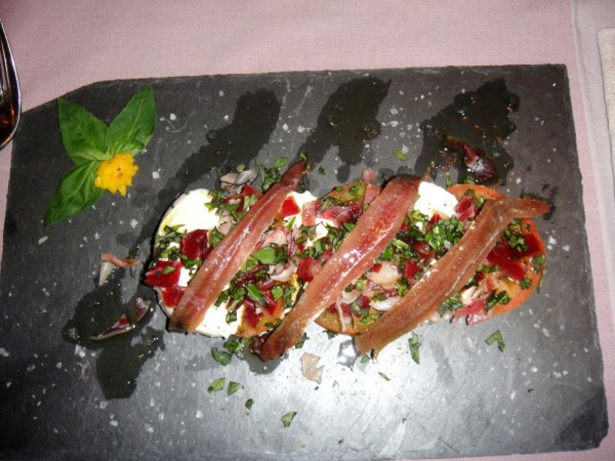 Ensalada caprese con anchoas del cantábrico AnteriorSiguiente EntranteFácil45 min367 Kcal Enviar esta receta a un amigo Imprimir esta página Preguntar al autor Publicar la foto de esta receta Ingredientes 4 1 lata de anchoas del Cantábrico en aceite oliva de Conservas Serrats Mozzarela de buffala Prosciutto di parma Tomates Raff Pimienta negra recién molida Albahaca fresca Sal Maldon Aceite de oliva Costo estimado: 3.36Euros€ (0.84€/porción)