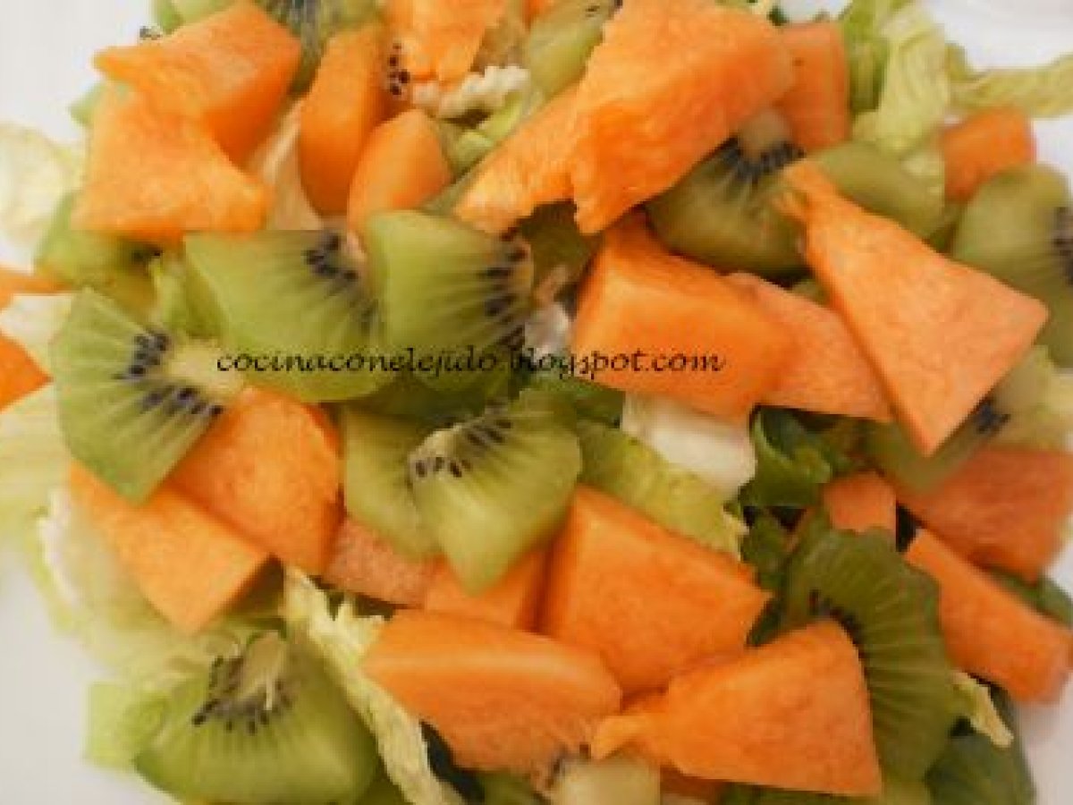 Ensalada con melon cantaloup EntranteFácil3 min Enviar esta receta a un amigo Imprimir esta página Preguntar al autor Publicar la foto de esta receta Ingredientes 4 Ingredientes: (no pongo cantidades, utilizar los ingredientes al gusto) Lechuga Melón cantaloup Kiwi Piña (opcional) Aceite de oliva Sal Vinagre de manzana (unas gotitas)