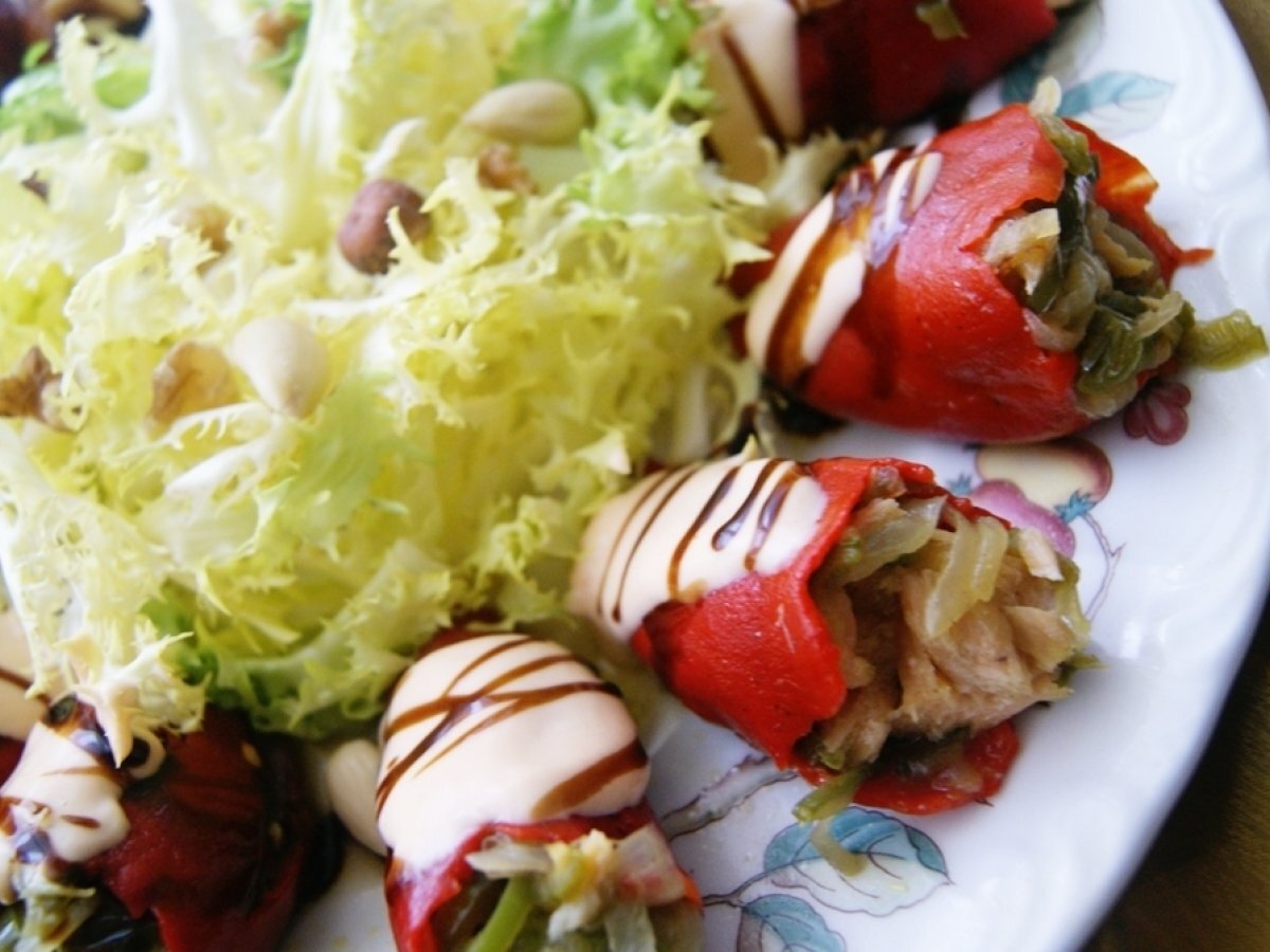 Ensalada con piquillos rellenos EntranteFácil30 min152 Kcal Enviar esta receta a un amigo Imprimir esta página Preguntar al autor Publicar la foto de esta receta Ingredientes 4 1 frasco de pimientos del piquillos ( unos 14 pimientos ) 4 pimientos verdes italianos 1 cebolla 1 frasco de salmón en aceite de oliva o de Bonito del Norte 1 escarola Frutos secos al gusto ( yo he puesto , avellanas , nueces y almendras ) Sal Crema de vinagre de modena Aceite de oliva virgen 1 ajo crudo Salsa rosa