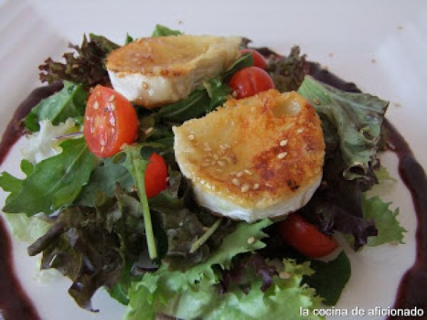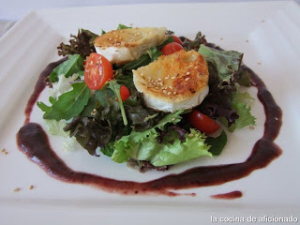 Ensalada con queso de cabra y vinagreta de arándano AnteriorSiguiente EntranteFácil20 min Enviar esta receta a un amigo Imprimir esta página Preguntar al autor Publicar la foto de esta receta Ingredientes 2 Una bolsa de vegetales variados. 2 rodajas de queso de cabra por persona Tomates cherry Semillas de sésamo tostadas. Para la vinagreta de arándanos: 3 cucharaditas de mermelada de arándanos. 4 cucharadas soperas de aceite de oliva virgen extra. 1 cucharada sopera de aceite de oliva virgen extra. Un poquito de sal.