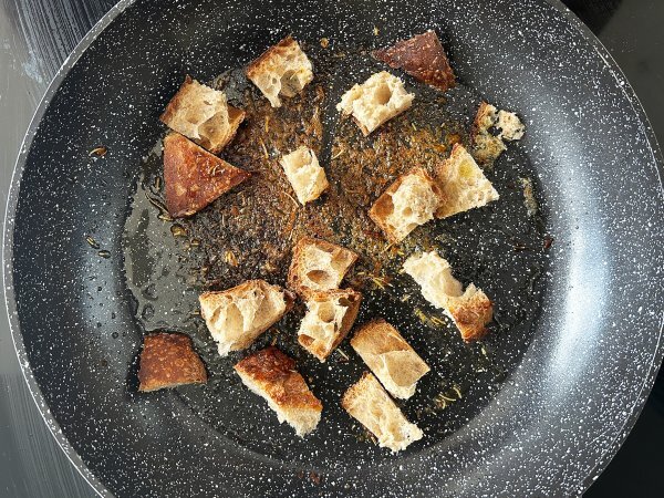 En la misma sartén, tuesta los trozos de pan rústico cortados en dados durante unos 2 minutos.