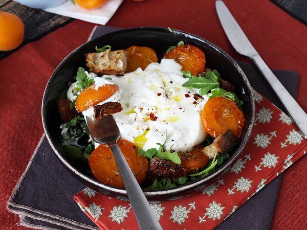 Monta la ensalada: coloca la rúcula en el fondo del plato, reparte los albaricoques asados con miel, coloca la burrata en el centro, añade los picatostes, un hilo de aceite de oliva y, si quieres, un poco de guindilla. ¡Y listo!.