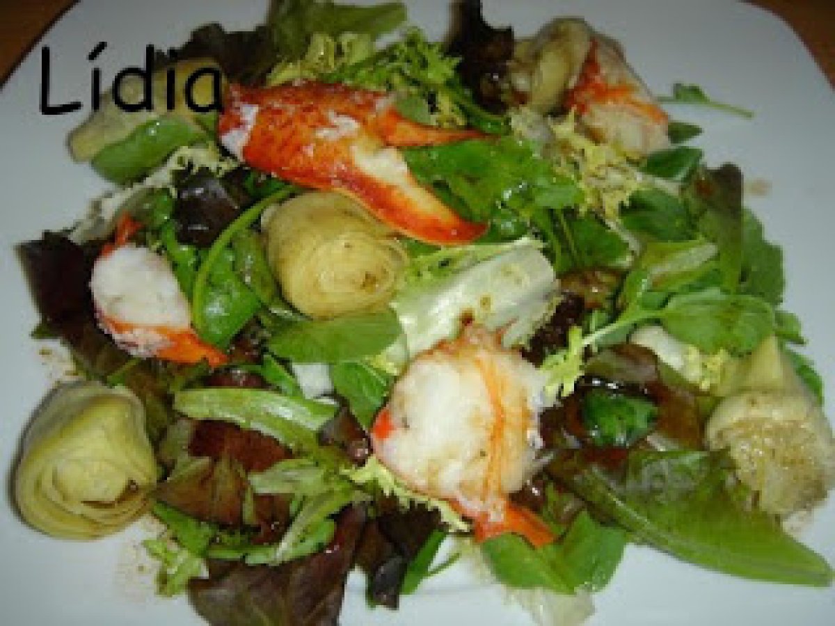 Ensalada de bogavante y alcachofas EntranteFácil15 min Enviar esta receta a un amigo Imprimir esta página Preguntar al autor Publicar la foto de esta receta Ingredientes 1 1 bogavante cocido 1 pote de corazones de alcachofas en conserva (cuando sea la época, mejor comprarlas frescas y hervir los corazones) ensalada variada: ensalada rizada, rúcula, berro y batavia roja aceite de oliva y aceite de cacahuete vinagre de modena sal y pimienta de colores