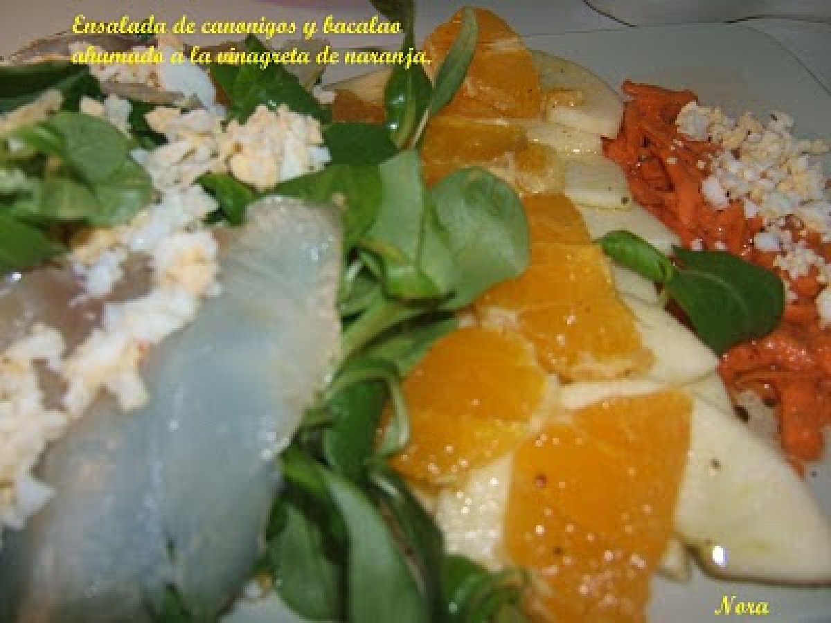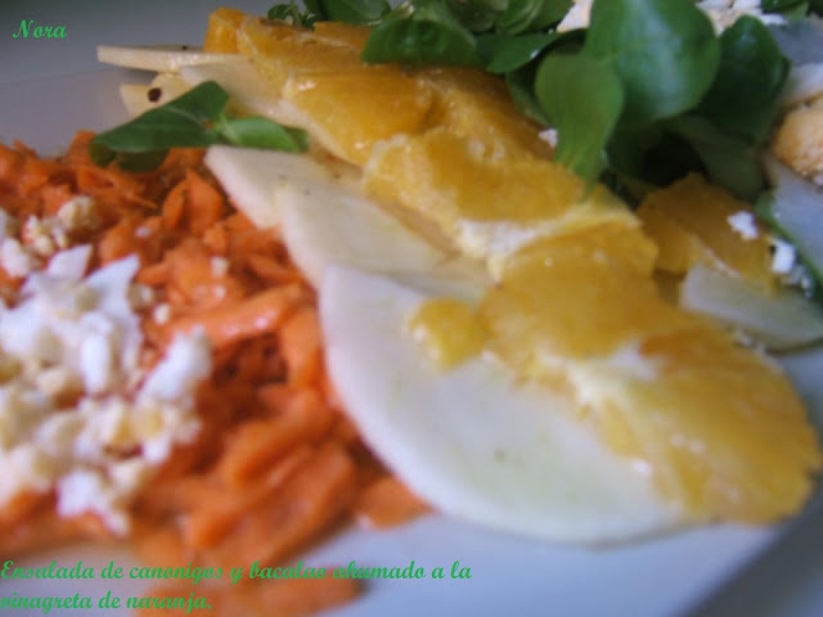 Ensalada de canonigos y bacalao ahumado a la vinagreta de naranja. AnteriorSiguiente EntranteFácil1 hora546 Kcal Enviar esta receta a un amigo Imprimir esta página Preguntar al autor Publicar la foto de esta receta Ingredientes 1 1/2 manzana 1 zanahoria 1/2 naranja Un puñado de canónigos 1 huevo cocido Bacalao ahumado El zumo de media naranja Aceite de oliva virgen extra vinagre de frambuesa sal y pimienta negra Costo estimado: 3.95Euros€ (3.95€/porción)