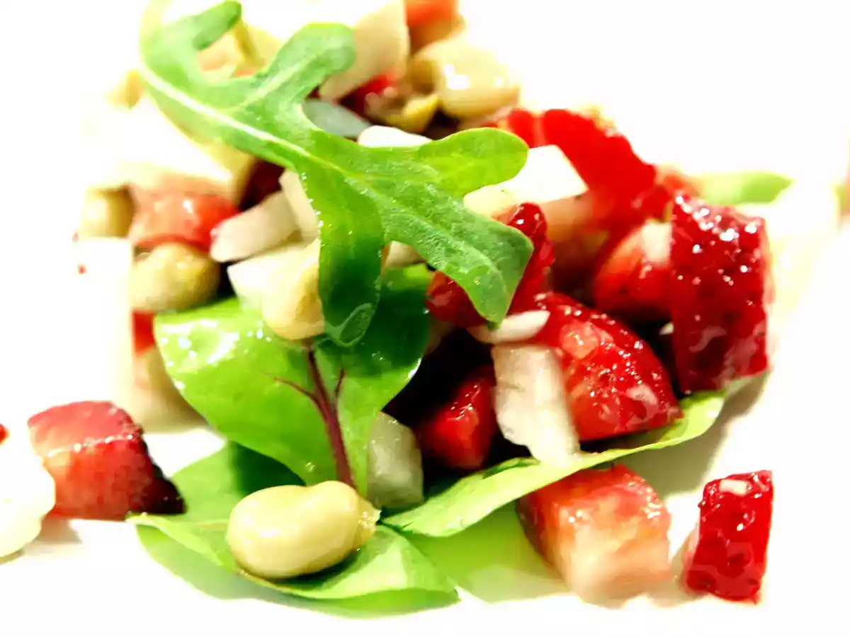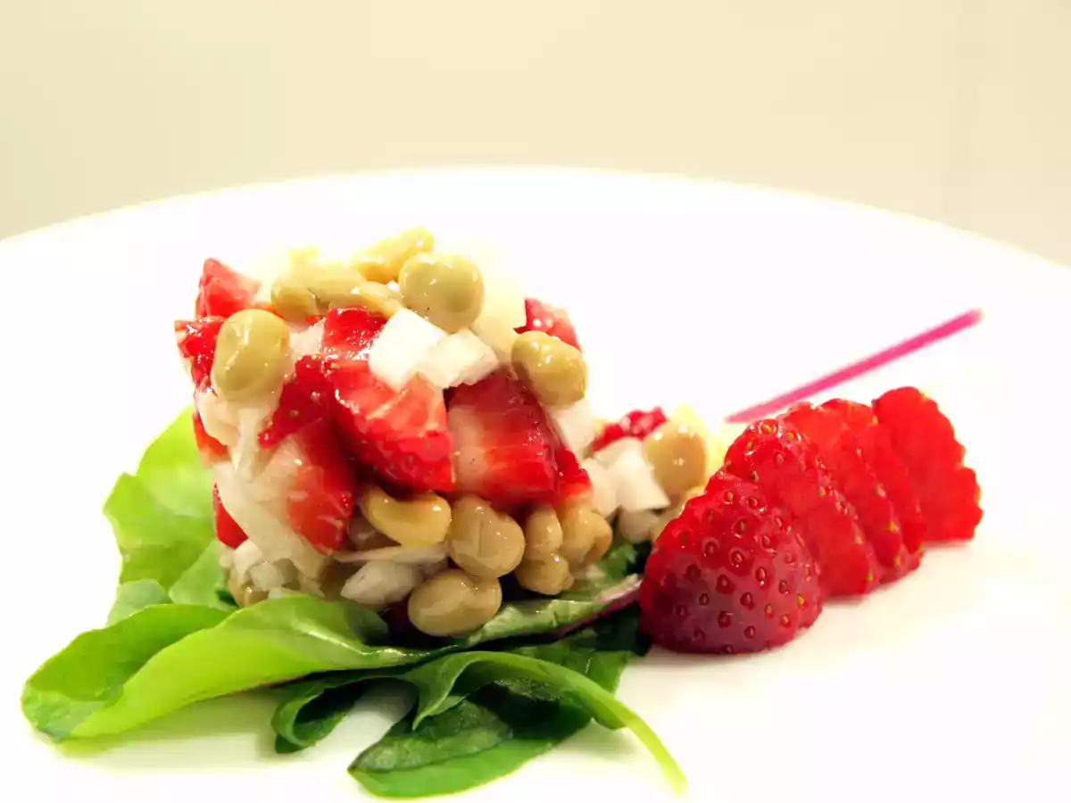 Ensalada de habas, fresas y queso AnteriorSiguiente EntranteMedio10 min Enviar esta receta a un amigo Imprimir esta página Preguntar al autor Publicar la foto de esta receta Ingredientes 2 Ingredientes 1 latita de habas en aceite 100 gr de fresas 1 cebolleta tierna 1 lata de espárragos queso feta en aceite a las finas hierbas unos brotes de lechuga y espinacas variadas sal ,aceite, vinagre de módena, una cucharadita de miel