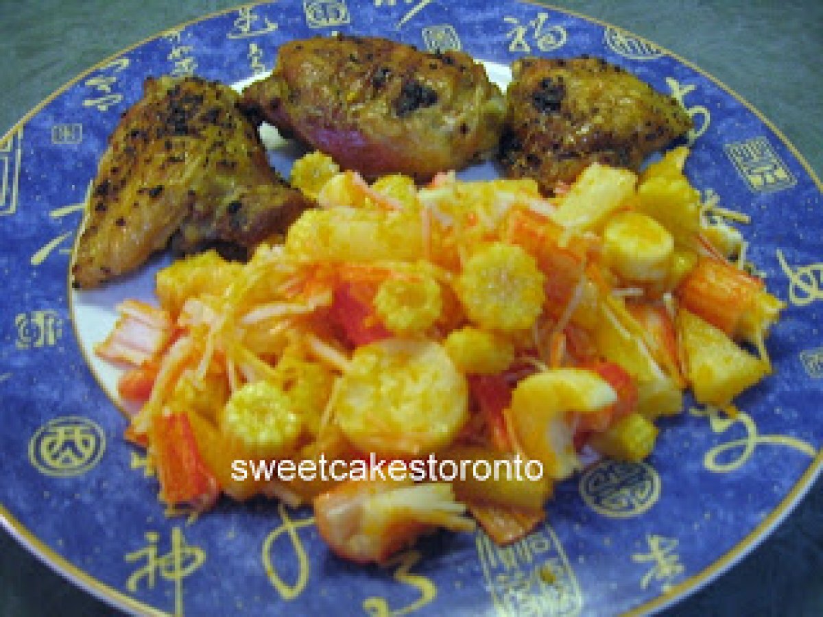 Ensalada de kanikama, palmitos......... AnteriorSiguiente EntranteFácil25 min Enviar esta receta a un amigo Imprimir esta página Preguntar al autor Publicar la foto de esta receta Ingredientes 2 500 gr de kanikama 120 gr de apio picado 1 zanahoria mediana rallada 1/2 palta picada 2 huevos duros 180 gr de mayonesa sal y pimienta a gusto