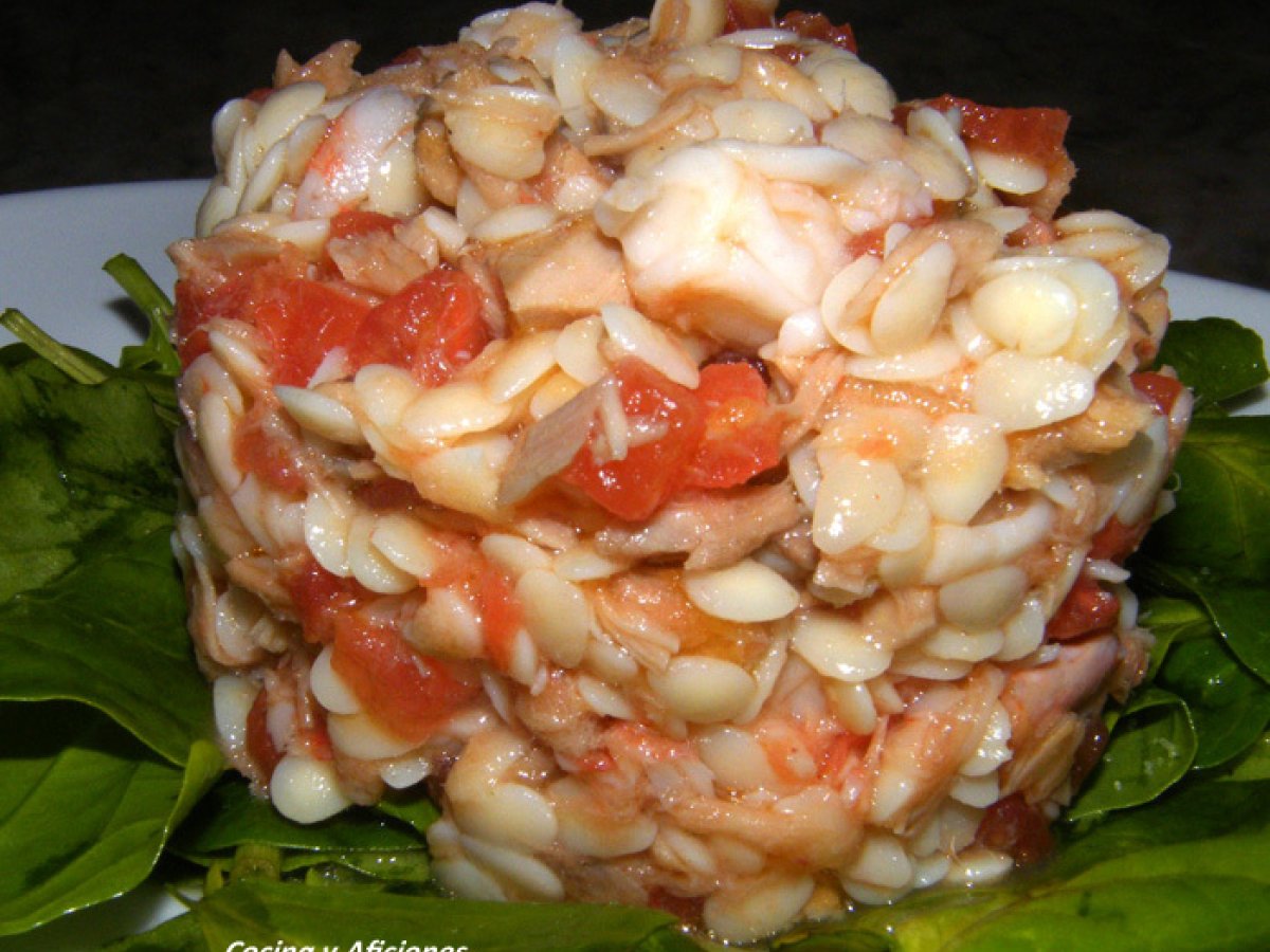 Ensalada de pasta ?semi di melone? con gambas y atún, receta EntranteFácil25 min140 Kcal Enviar esta receta a un amigo Imprimir esta página Preguntar al autor Publicar la foto de esta receta Ingredientes 1 4 c/s de ?Semi di Melone? pasta semilla de melón, 2 tomates medianos, 250 gr. de gambas, 200 gr. de atún en escabeche, aceite, vinagre sidra, limón, sal, hojas de brotes de espinaca, aceite de guindillas. Costo estimado: 0.8Euros€ (0.8€/porción)