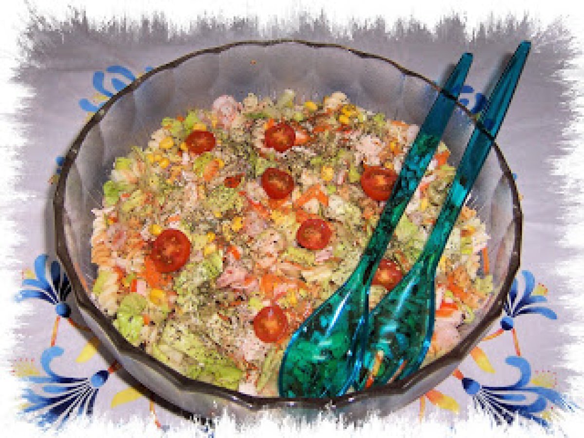 Ensalada de pasta y marisco EntranteFácil55 min248 Kcal Enviar esta receta a un amigo Imprimir esta página Preguntar al autor Publicar la foto de esta receta Ingredientes 5 Espirales de pasta vegetal 200 g gambas peladas 1 lechuga romana picada 2 tomates de la pera rallados 1 zanahoria rallada 140 g maiz 1 lata atún al natural 1 paquete de tronquitos de mar orégano eneldo sal y aceite de oliva