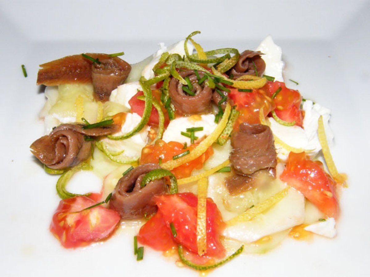 Ensalada de pepino, anchoas y aliño de crème fraîche EntranteFácil20 min Enviar esta receta a un amigo Imprimir esta página Preguntar al autor Publicar la foto de esta receta Ingredientes 2 2 pepinos medianos muy frescos, mozarella, 1 limón verde, 1 limón, Cascara de limón, sal, pimienta, cebollino picado, flores de tomare, anchoas estrella del Mar. Para la aliño de créme fraîche: 4 cucharadas soperas de aceite de oliva virgen, 3 cucharadas soperas de crème fraîche, zumo de limón, 1 cuchara de postre de mostaza suave, pimienta y sal.