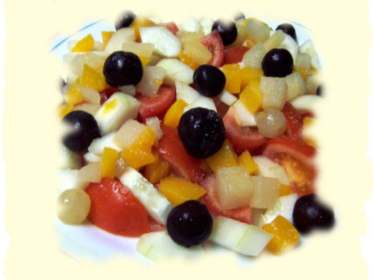 Ensalada de pepino y frutas EntranteFácil15 min227 Kcal Enviar esta receta a un amigo Imprimir esta página Preguntar al autor Publicar la foto de esta receta Ingredientes 1 2 tomates rojos 1 pepino Cerezas frescas 1 botecito de macedonia de frutas sin azúcar Crema de vinagre balsámico de módena Aceite de oliva Sal Costo estimado: 1.14Euros€ (1.14€/porción)