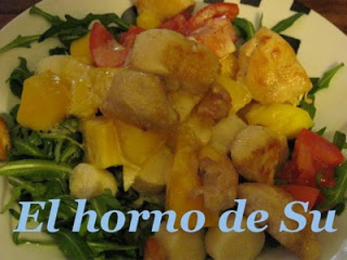 Ensalada de pollo y palmitos EntranteFácil50 min Enviar esta receta a un amigo Imprimir esta página Preguntar al autor Publicar la foto de esta receta Ingredientes 2 1 bolsita de rúcula unos 100 g de pollo 1 tarro pequeño de palmitos 1 mango pequeño 1 tomate de ensalada aceite de oliva Para el aliño: 45 ml de aceite de oliva virgen extra 1 huevo 15 ml de vinagre 1 diente de ajo sal pipmienta negra recién molida 5 ml de brandy 10 ml de tomate triturado