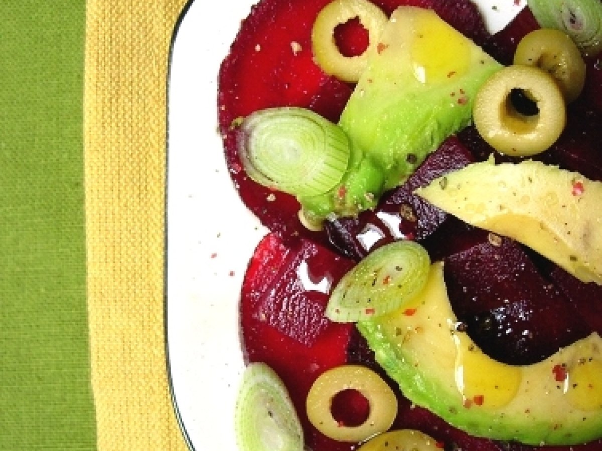 Ensalada de remolacha y aguacate EntranteFácil15 min216 Kcal Enviar esta receta a un amigo Imprimir esta página Preguntar al autor Publicar la foto de esta receta Ingredientes 2 1 remolacha hervida 1 aguacate 1 cebolleta Aceitunas verdes Aceite de oliva virgen extra Zumo de limón o Vinagre Pimienta molida Sal