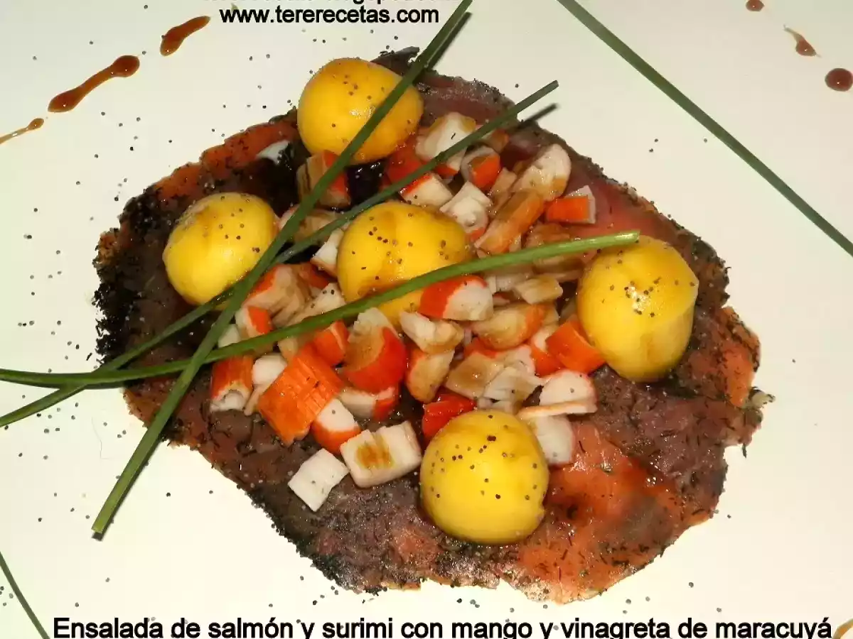 Ensalada de salmón ahumado y surimi con mango y vinagreta de maracuyá.