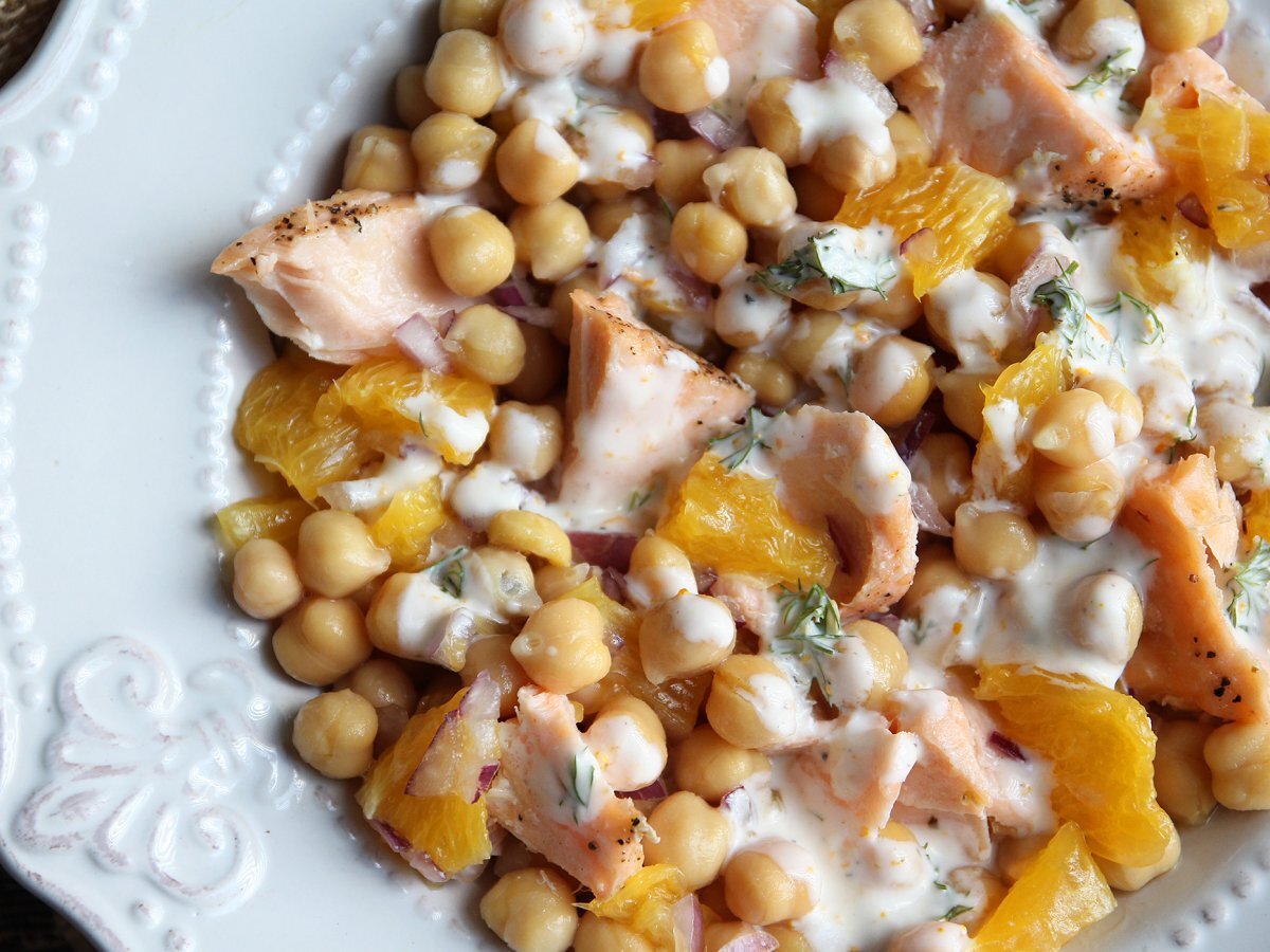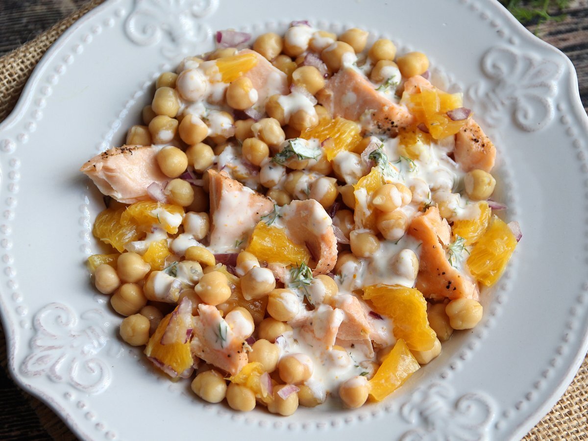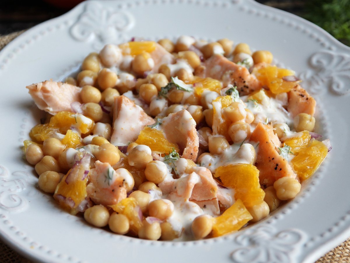 Dale un toque original a tus ensaladas. ¡Prueba nuestra combinación de salmón + garbanzos + naranja con un refrescante toque de eneldo fresco! Un plato rico en proteínas, muy cómodo para llevar al trabajo y disfrutar así de un almuerzo sano y equilibrado. En cuanto al aliño, te encantará nuestra combinación con ligeros matices ácidos. Déjate tentar por esta receta que te explicamos paso a paso a continuación ↓